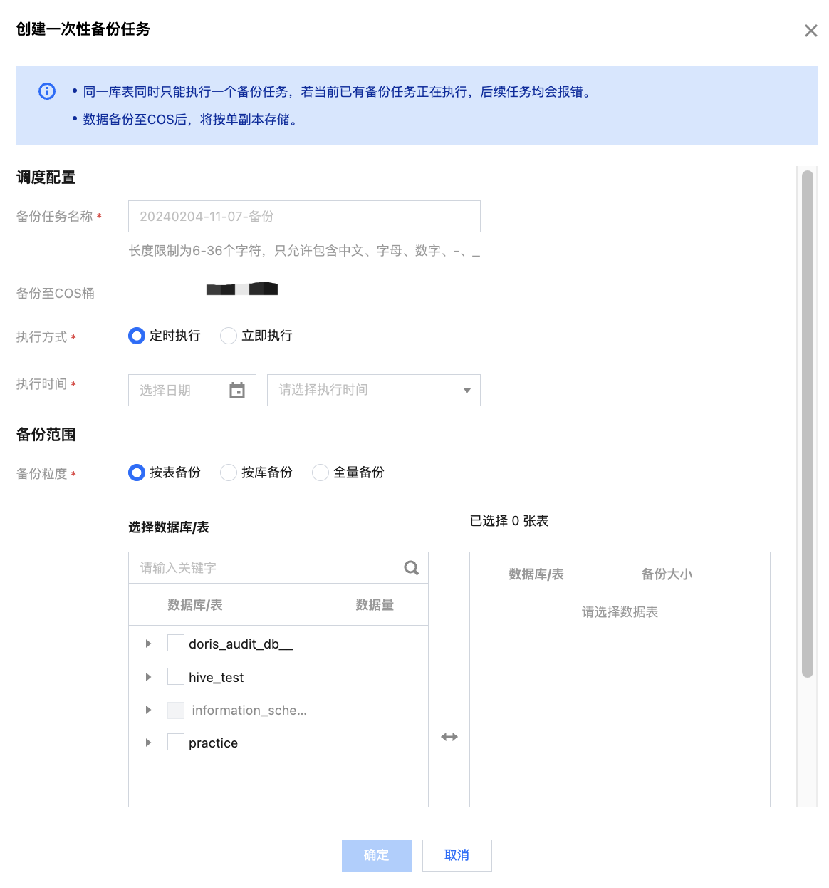 支持创建多个周期性备份任务,但若多个任务同时对一张表进行备份,后续任务均会报错。为保障数据完整,可在上个备份任务结束后通过“一次性备份数据”功能重新备份。