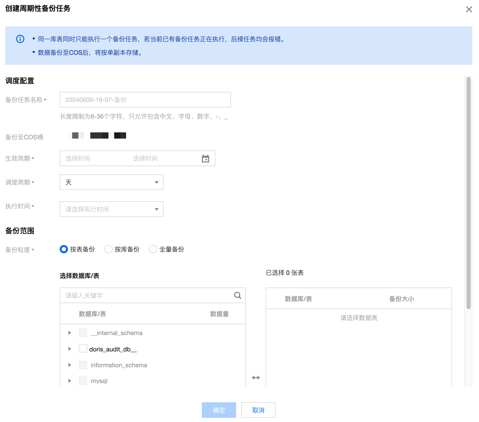 创建周期性备份任务时,可配置项包括:生效周期、调度周期、执行时间。创建成功后,备份任务将在生效周期内,按调度周期在指定时间执行。