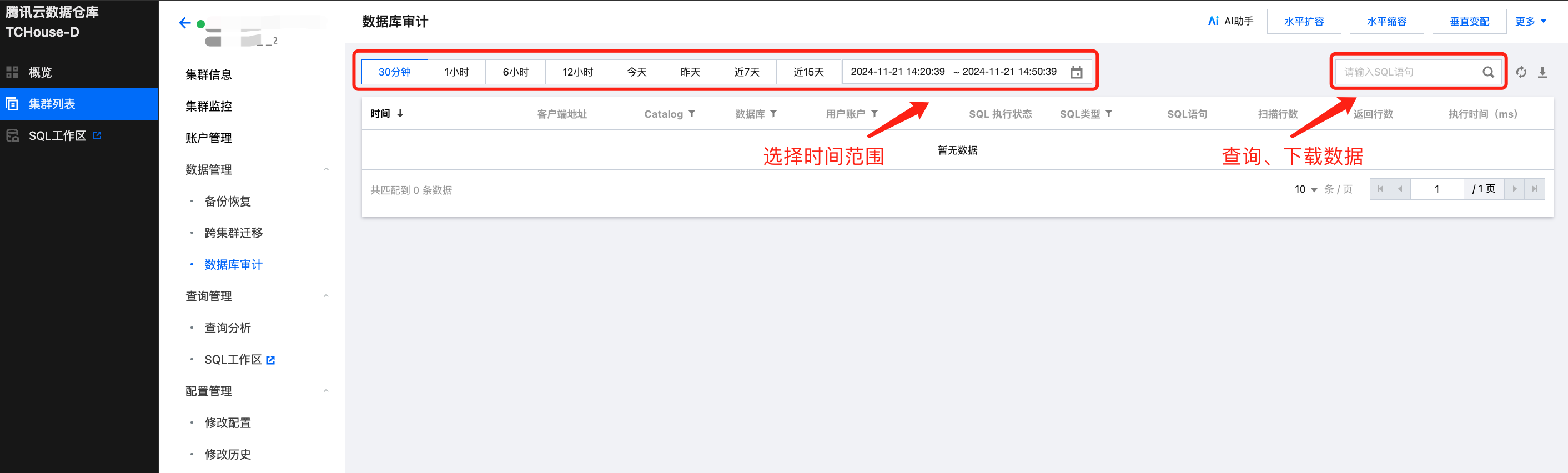 数据库审计功能展示了集群内所有 SQL 操作的历史信息,并支持搜索、筛选、下载。