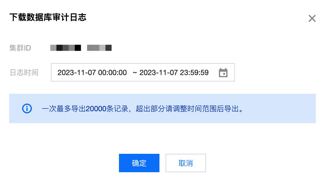下载数据:支持导出指定时间范围内的审计日志,单次导出上限为20000条记录,若超出请调整时间范围。