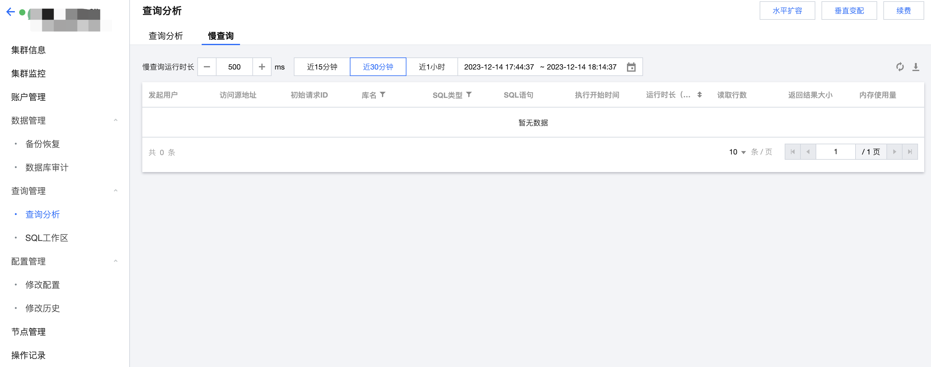 3、在此页面中,默认展示耗时500ms以上的慢 SQL。您可根据需要调整判别慢查询 SQL 的时长阈值,最小支持设为 100 ms。