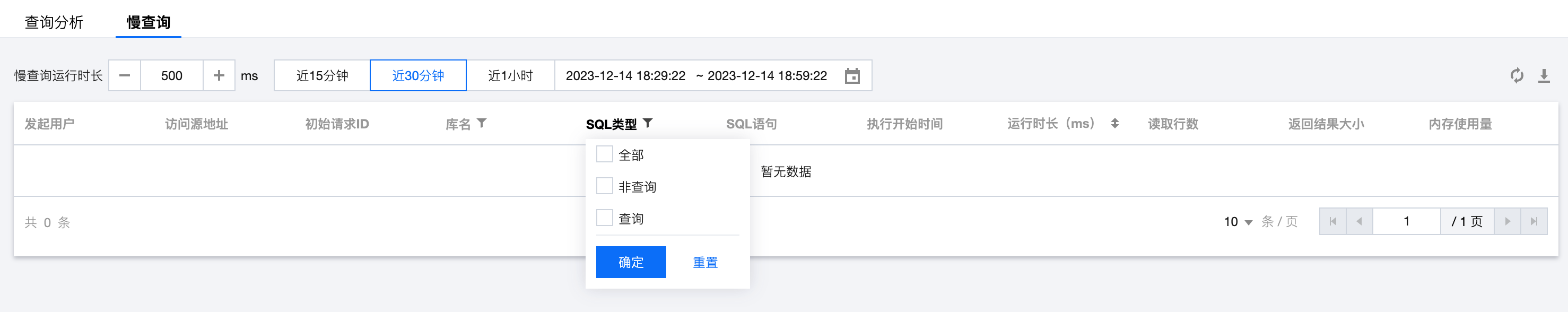 支持对慢查询列表按运行时长排序,或基于库名、SQL 类型筛选: