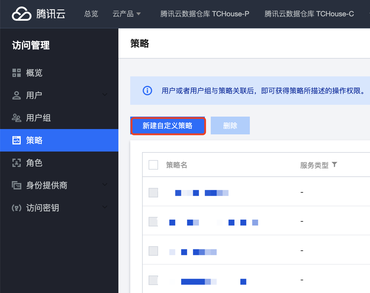 QcloudCdwdorisFullAccess | 腾讯云数据仓库 TCHouse-D(Cdwdoris)全读写访问权限 | 需要进入并使用腾讯云数据仓库 TCHouse-D 集群时需要 |