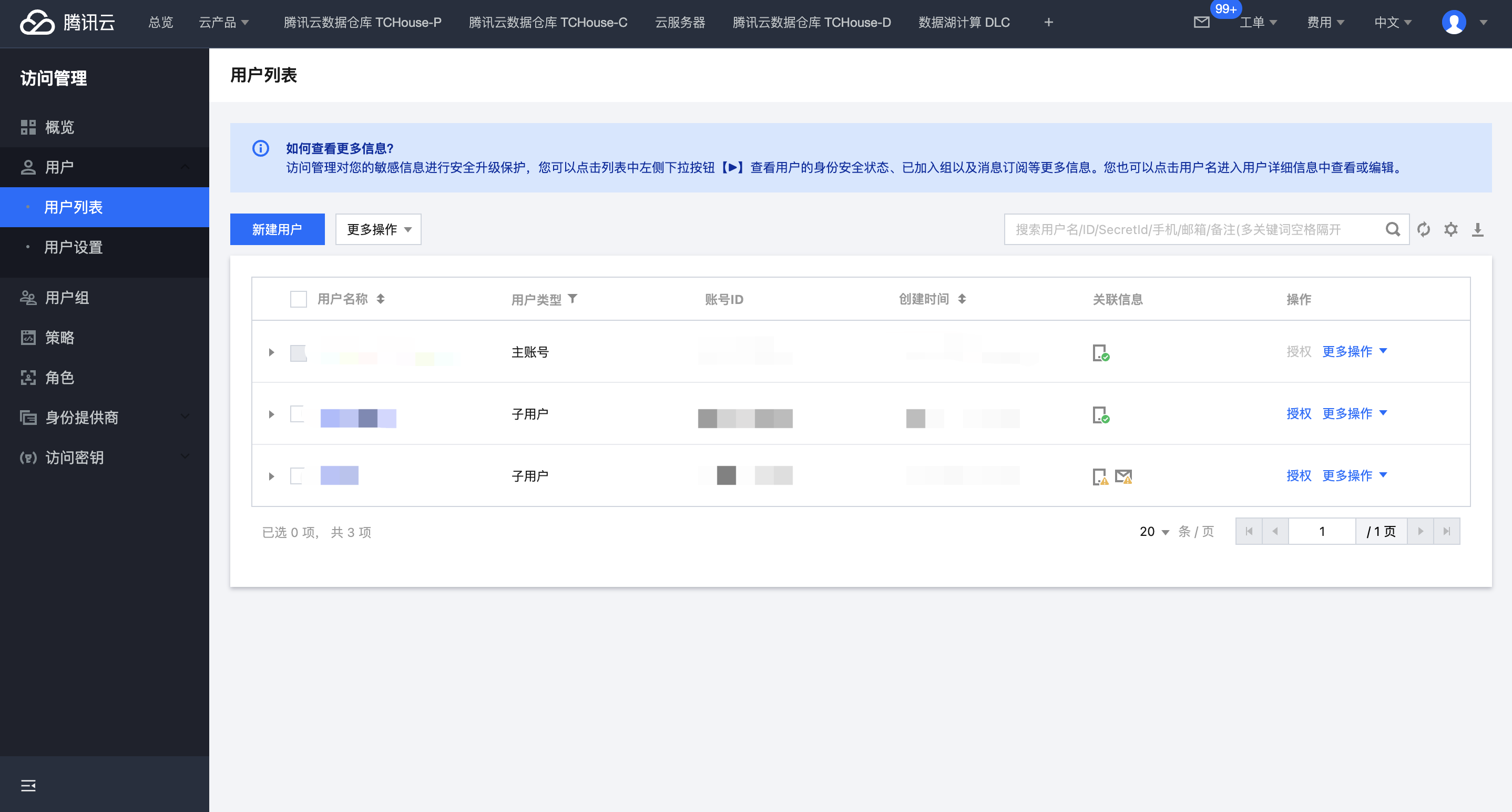 QcloudCamFullAccess | 用户与权限(CAM)全读写访问权限 | 子账号在腾讯云数据仓库 TCHouse-D 集群开启湖仓一体时需要 |