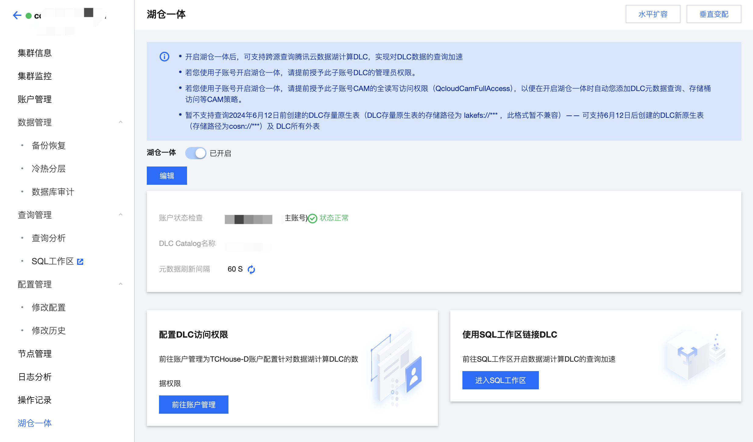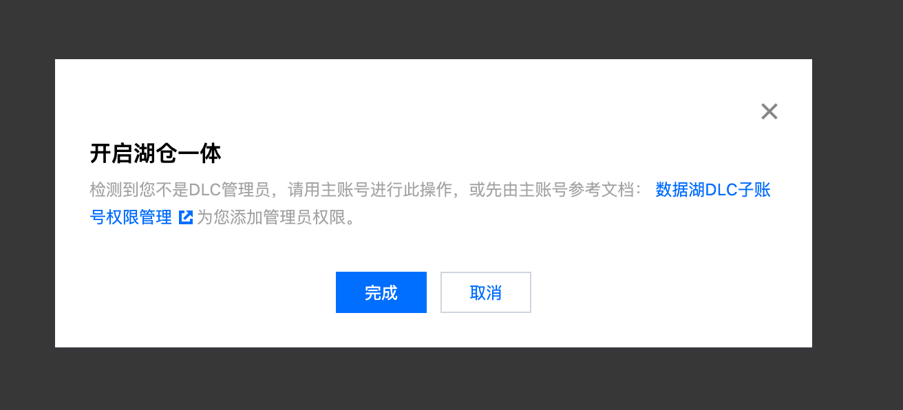 3. 开启湖仓一体的账号需要有 DLC 的管理权限,请使用主账号(或有 DLC 管理员权限的子账号)进行此操作。