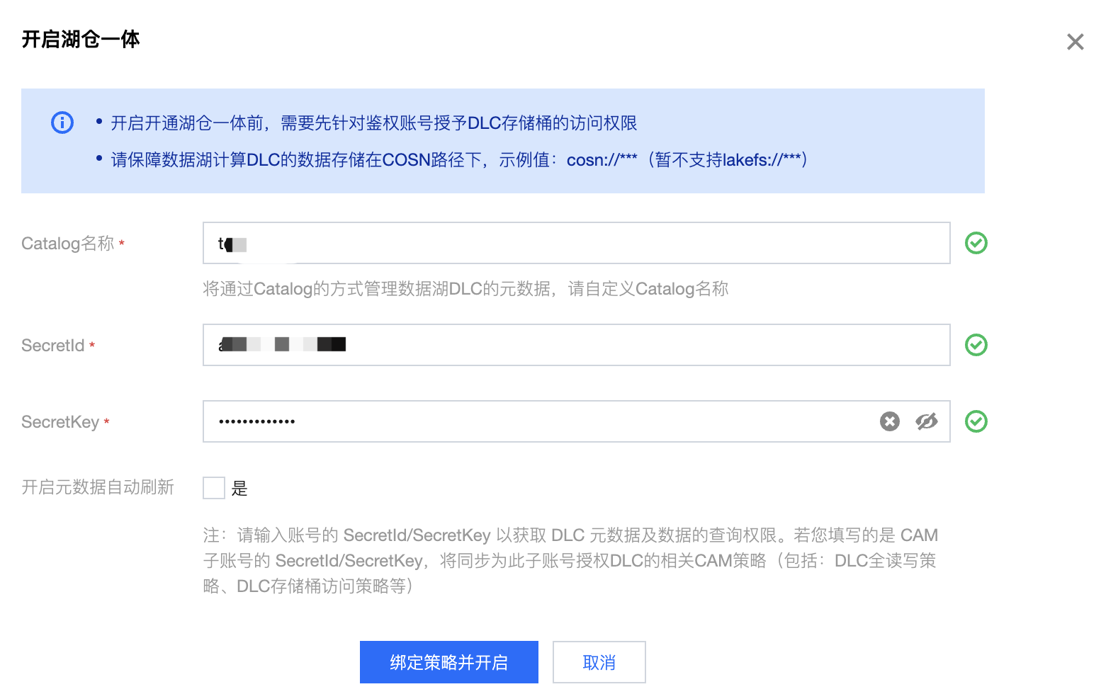 5. 完成配置后,点击绑定策略并开启按钮,即可完成湖仓一体的开通配置。
