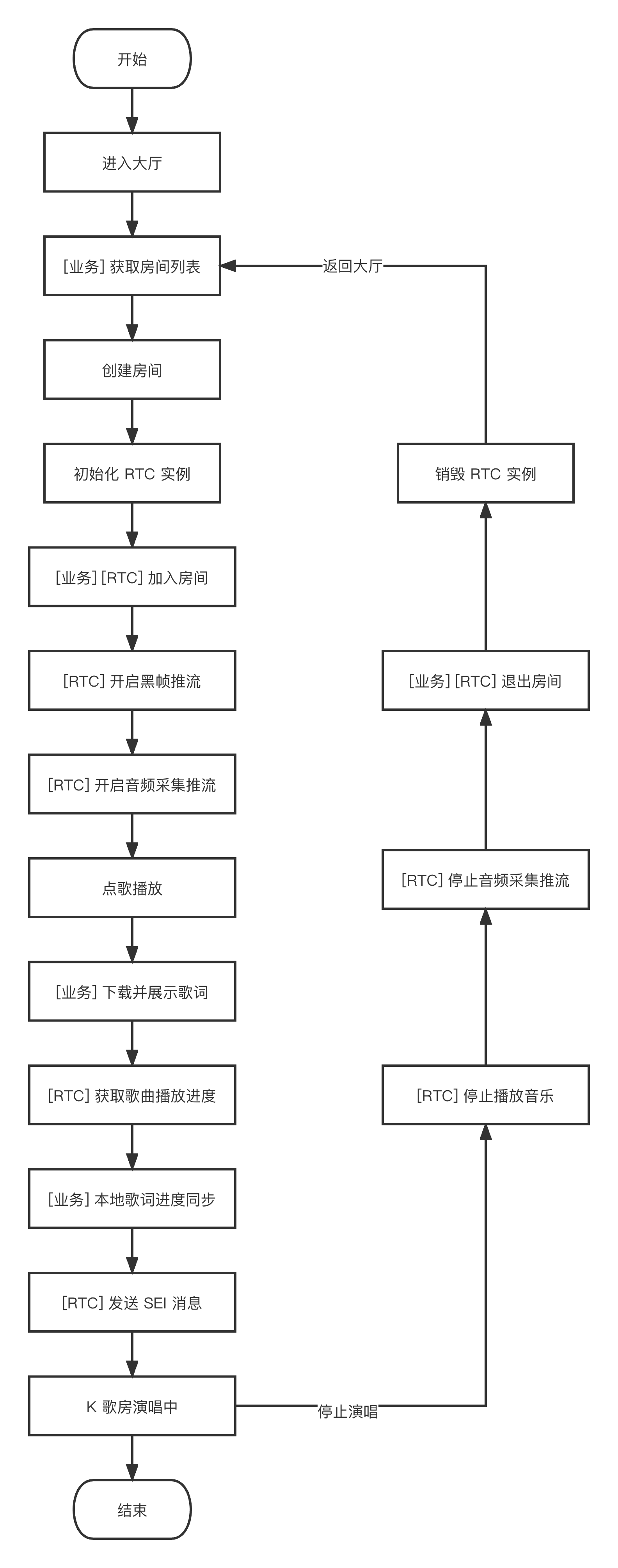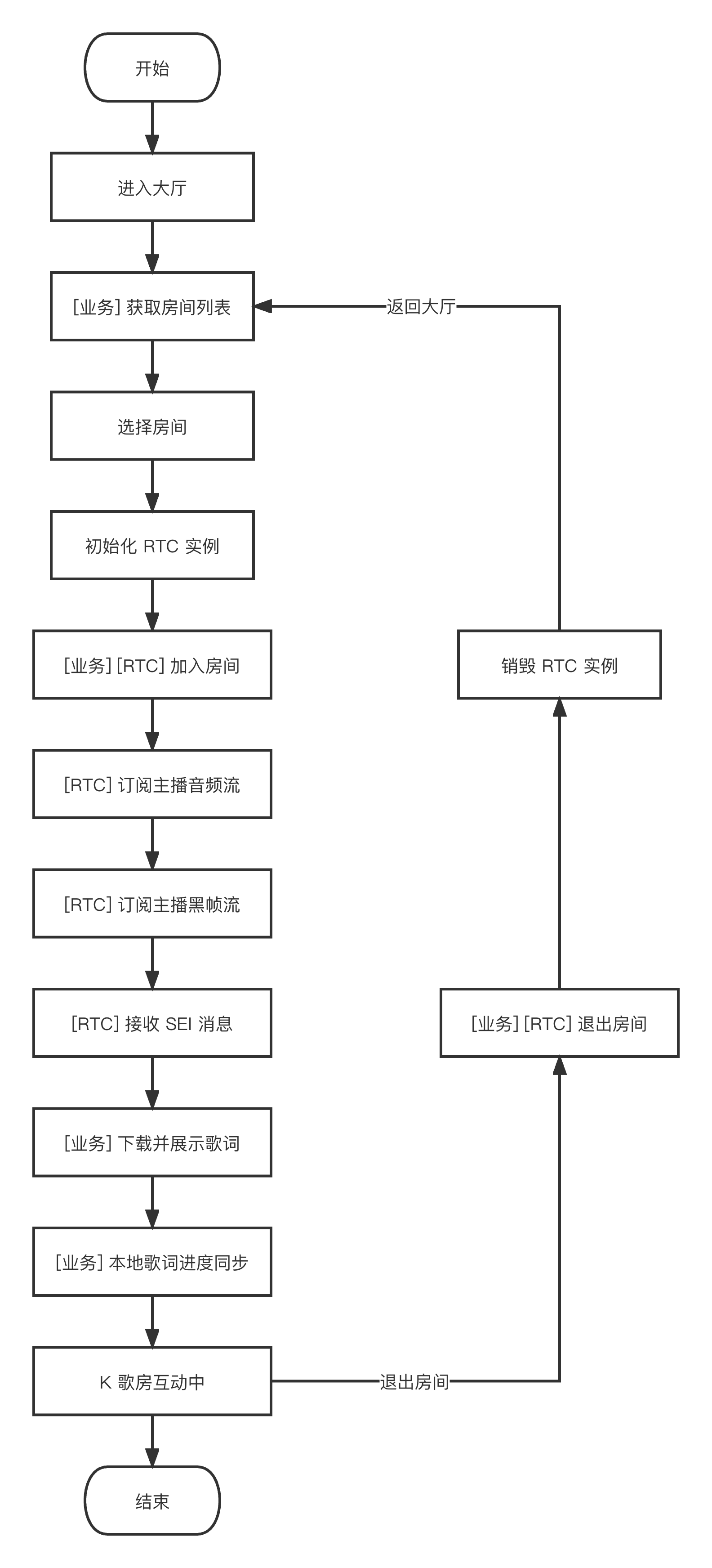 TRTCAppSceneLIVE。- (void)onUserVideoAvailable:(NSString *)userId available:(BOOL)available {if (available) {[self.trtcCloud startRemoteView:userId view:nil];} else {[self.trtcCloud stopRemoteView:userId];}}- (void)onRecvSEIMsg:(NSString *)userId message:(NSData *)message {JSONModel *json = [[JSONModel alloc] initWithData:message error:nil];NSDictionary *dic = json.toDictionary;int32_t musicId = [dic[@"musicId"] intValue];NSInteger progress = [dic[@"progress"] integerValue];NSInteger duration = [dic[@"duration"] integerValue];// ......// TODO 更新歌词控件逻辑:// 根据接收到的最新进度和本地歌词进度误差,判断是否需要 seek 歌词控件// ......}
