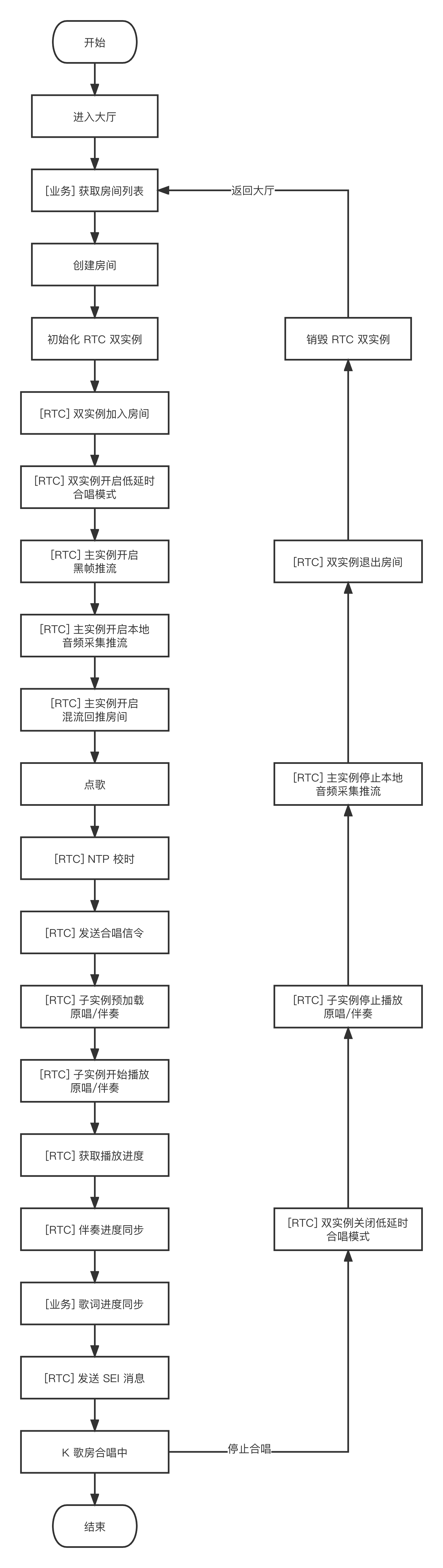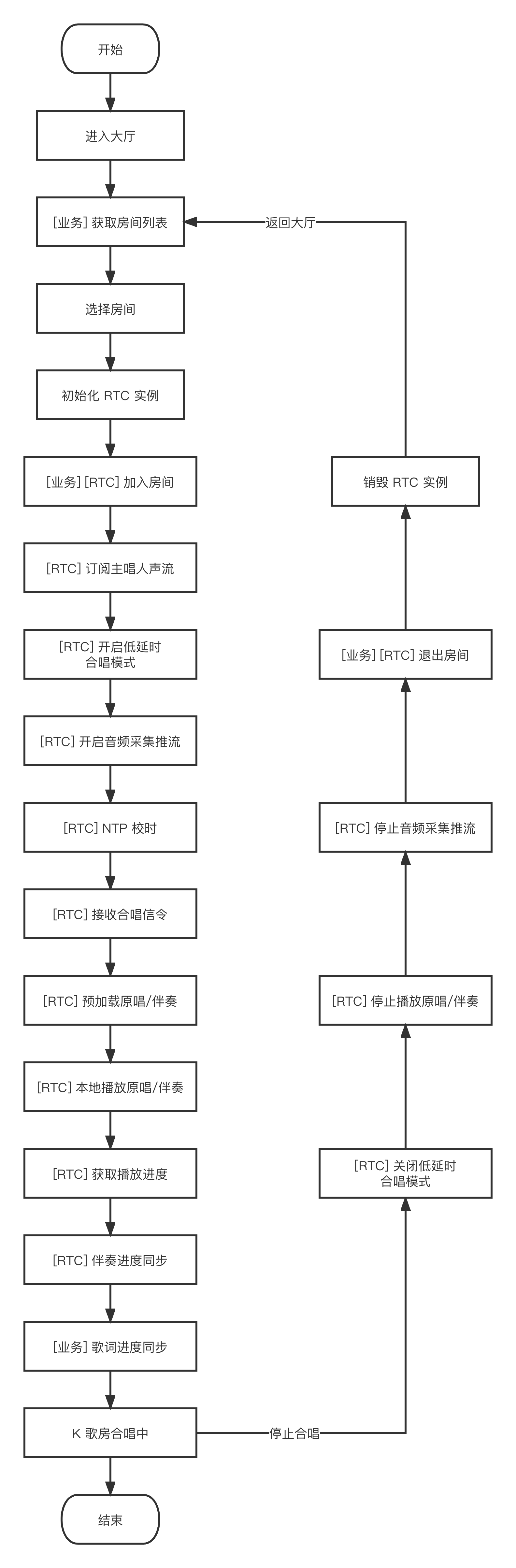 // 主实例进房结果事件回调- (void)onEnterRoom:(NSInteger)result {if (result > 0) {// 主实例取消订阅子实例发布的音乐流[self.trtcCloud muteRemoteAudio:[self.userId stringByAppendingString:@"_bgm"] mute:YES];// 主实例开启补黑帧的实验性接口[self.trtcCloud callExperimentalAPI:@"{\\"api\\":\\"enableBlackStream\\",\\"params\\": {\\"enable\\":true}}"];// 主实例开启合唱模式的实验性接口[self.trtcCloud callExperimentalAPI:@"{\\"api\\":\\"enableChorus\\",\\"params\\":{\\"enable\\":true,\\"audioSource\\":0}}"];// 主实例开启低延时模式的实验性接口[self.trtcCloud callExperimentalAPI:@"{\\"api\\":\\"setLowLatencyModeEnabled\\",\\"params\\":{\\"enable\\":true}}"];// 主实例启用音量大小回调TRTCAudioVolumeEvaluateParams *aveParams = [[TRTCAudioVolumeEvaluateParams alloc] init];aveParams.interval = 300;[self.trtcCloud enableAudioVolumeEvaluation:YES withParams:aveParams];// 主实例设置全程媒体音量类型[self.trtcCloud setSystemVolumeType:TRTCSystemVolumeTypeMedia];// 主实例采集和发布本地音频,同时设置音质[self.trtcCloud startLocalAudio:TRTCAudioQualityMusic];} else {// result 代表进房失败的错误码NSLog(@"Enter room failed");}}// 子实例进房结果事件回调- (void)onEnterRoom:(NSInteger)result {if (result > 0) {// 子实例开启合唱模式的实验性接口[self.subCloud callExperimentalAPI:@"{\\"api\\":\\"enableChorus\\",\\"params\\":{\\"enable\\":true,\\"audioSource\\":1}}"];// 子实例开启低延时模式的实验性接口[self.subCloud callExperimentalAPI:@"{\\"api\\":\\"setLowLatencyModeEnabled\\",\\"params\\":{\\"enable\\":true}}"];// 子实例设置全程媒体音量类型[self.subCloud setSystemVolumeType:TRTCSystemVolumeTypeMedia];// 子实例设置音质[self.subCloud setAudioQuality:TRTCAudioQualityMusic];} else {// result 代表进房失败的错误码NSLog(@"Enter room failed");}}