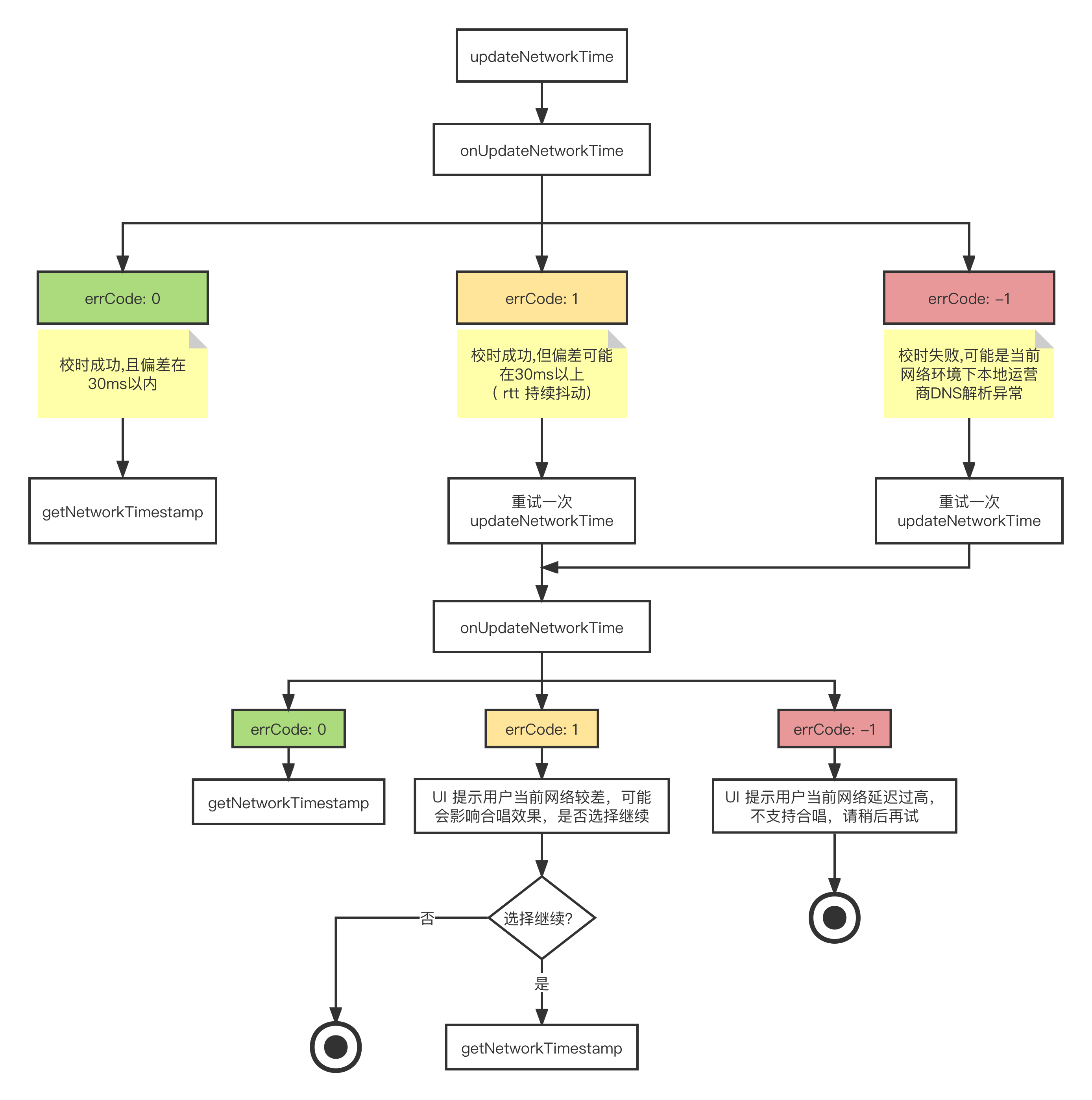 - (void)updateNetworkTimeExample {[TXLiveBase sharedInstance].delegate = self;[TXLiveBase updateNetworkTime];}- (void)onUpdateNetworkTime:(int)errCode message:(NSString *)errMsg {// errCode 0: 校时成功且偏差在30ms以内;1: 校时成功但偏差可能在30ms以上;-1: 校时失败if (errCode == 0) {// 校时成功,获取 NTP 时间戳NSInteger ntpTime = [TXLiveBase getNetworkTimestamp];} else {NSLog(@"校时失败,可尝试重新校时");}}
