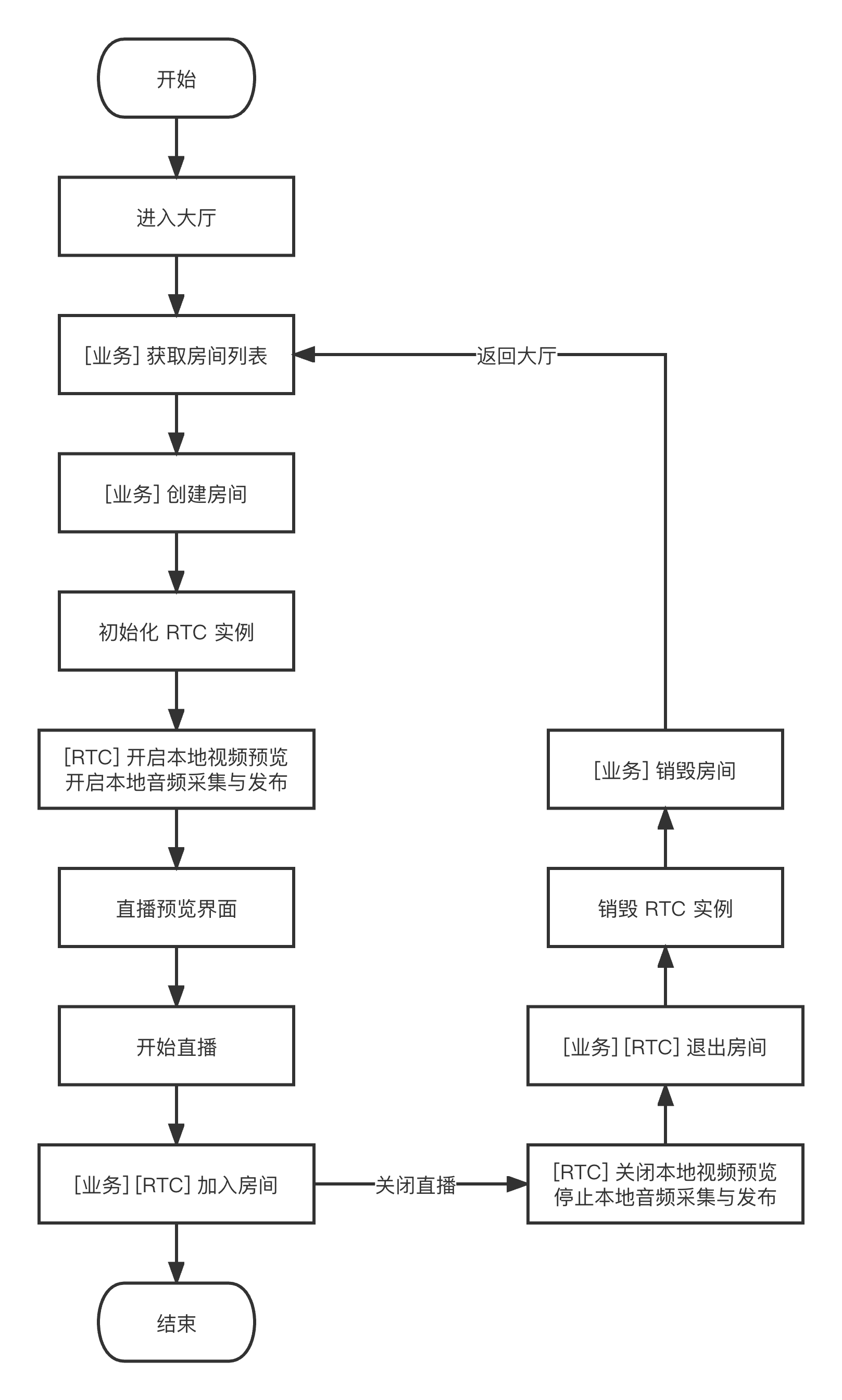 - (void)exitRoom {[self.trtcCloud stopLocalAudio];[self.trtcCloud stopLocalPreview];[self.trtcCloud exitRoom];}// 离开房间事件回调- (void)onExitRoom:(NSInteger)reason {if (reason == 0) {NSLog(@"主动调用 exitRoom 退出房间");} else if (reason == 1) {NSLog(@"被服务器踢出当前房间");} else if (reason == 2) {NSLog(@"当前房间整个被解散");}}