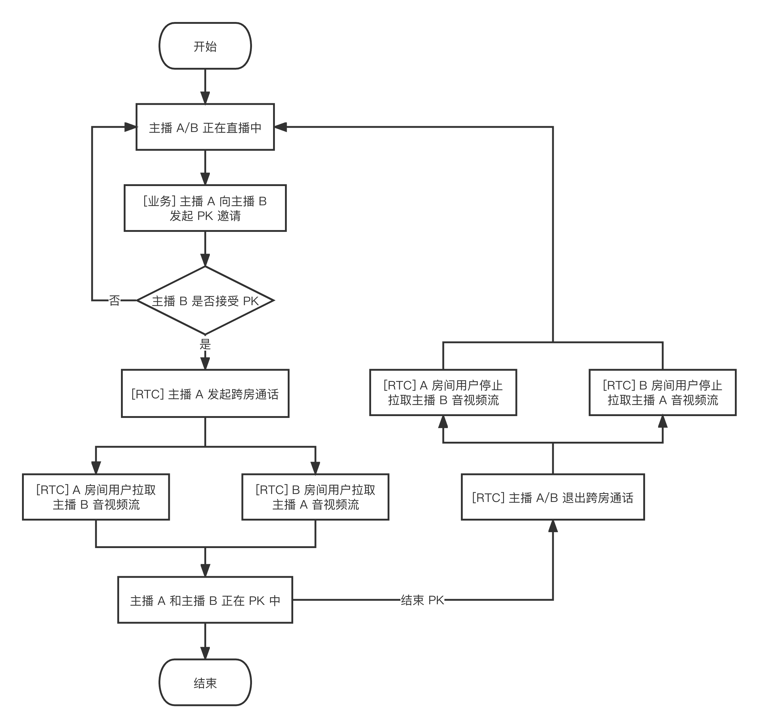 ConnectOtherRoom() 来实现与多个房间主播跨房连麦,目前限制一个房间最多可以和其他三个房间的主播跨房连麦,一个房间中最多10个主播可与其他房间的主播跨房连麦。- (void)onUserAudioAvailable:(NSString *)userId available:(BOOL)available {// 某远端用户发布/取消了自己的音频// 在自动订阅模式下,您无需做任何操作,SDK 会自动播放远端用户音频}- (void)onUserVideoAvailable:(NSString *)userId available:(BOOL)available {// 某远端用户发布/取消了主路视频画面if (available) {// 订阅远端用户的视频流,并绑定视频渲染控件[self.trtcCloud startRemoteView:userId streamType:TRTCVideoStreamTypeBig view:self.remoteView];} else {// 停止订阅远端用户的视频流,并释放渲染控件[self.trtcCloud stopRemoteView:userId streamType:TRTCVideoStreamTypeBig];}}