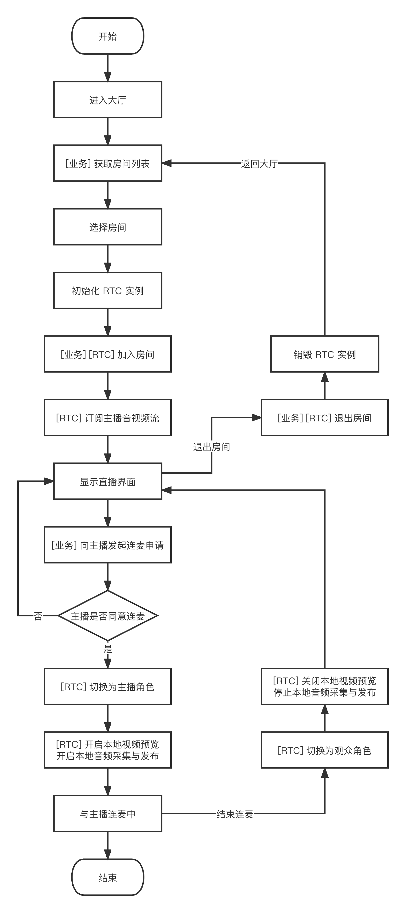 - (void)switchToAudience {// 切换为观众角色[self.trtcCloud switchRole:TRTCRoleAudience];}// 切换角色事件回调- (void)onSwitchRole:(TXLiteAVError)errCode errMsg:(NSString *)errMsg {if (errCode == ERR_NULL) {// 停止摄像头采集推流[self.trtcCloud stopLocalPreview];// 停止麦克风采集推流[self.trtcCloud stopLocalAudio];}}