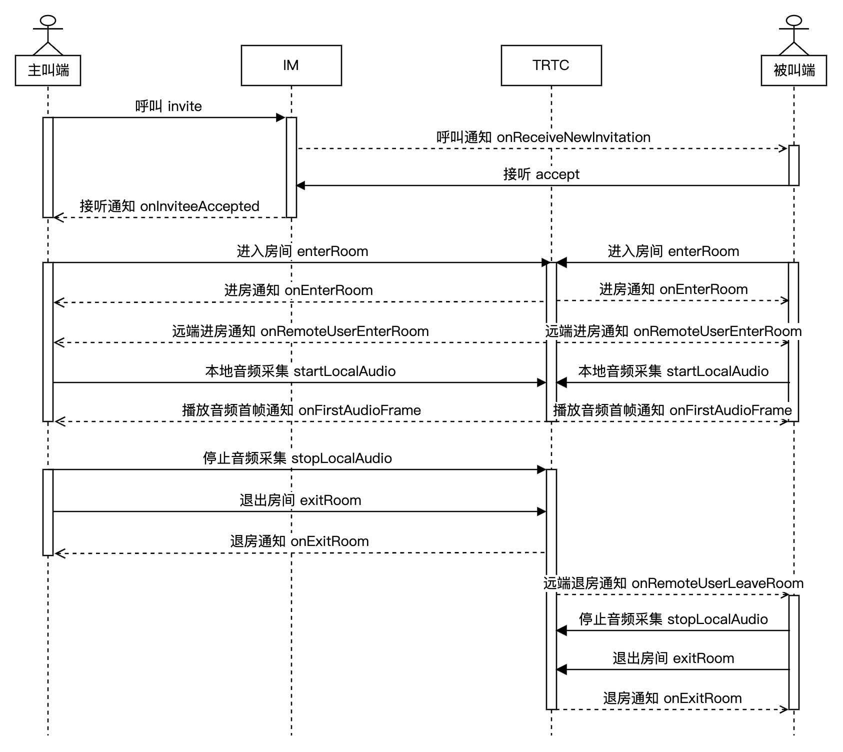 private void startAudioCall() {TRTCCloudDef.TRTCParams params = new TRTCCloudDef.TRTCParams(); params.sdkAppId = SDKAPPID; // TRTC应用标识, 在控制台获取 params.userSig = USERSIG; // TRTC鉴权凭证, 在服务端生成params.strRoomId = roomId; // 房间号, 以字符串房间号为例 params.userId = userId; // 用户名, 建议和IM保持同步mTRTCCloud.startLocalAudio(TRTCCloudDef.TRTC_AUDIO_QUALITY_SPEECH);mTRTCCloud.enterRoom(params, TRTCCloudDef.TRTC_APP_SCENE_AUDIOCALL);}