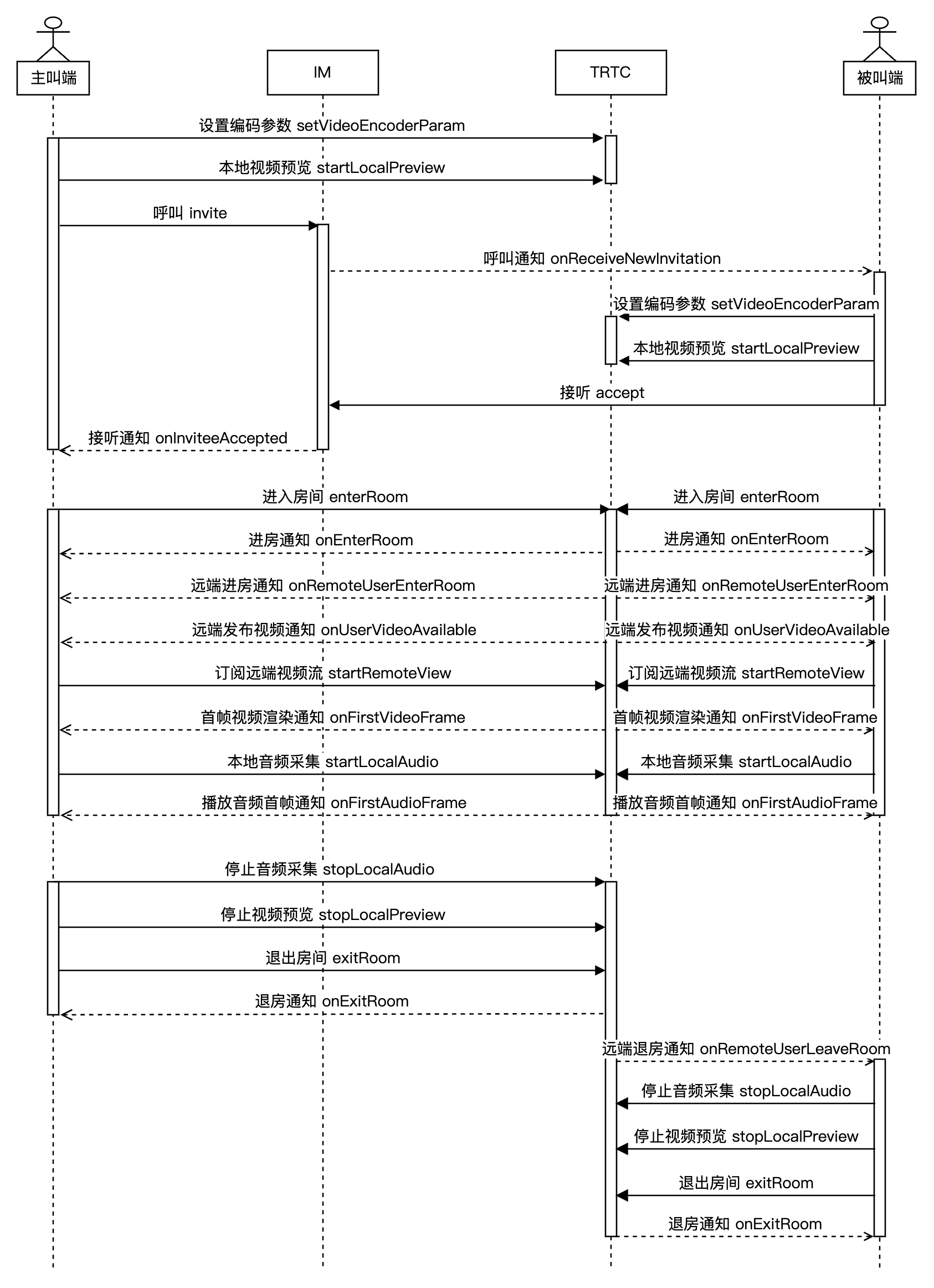 private void startVideoCall() {TRTCCloudDef.TRTCParams params = new TRTCCloudDef.TRTCParams();params.sdkAppId = SDKAPPID; // TRTC应用标识, 在控制台获取params.userSig = USERSIG; // TRTC鉴权凭证, 在服务端生成params.strRoomId = roomId; // 房间号, 以字符串房间号为例params.userId = userId; // 用户名, 建议和IM保持同步mTRTCCloud.startLocalAudio(TRTCCloudDef.TRTC_AUDIO_QUALITY_SPEECH);mTRTCCloud.enterRoom(params, TRTCCloudDef.TRTC_APP_SCENE_VIDEOCALL);}