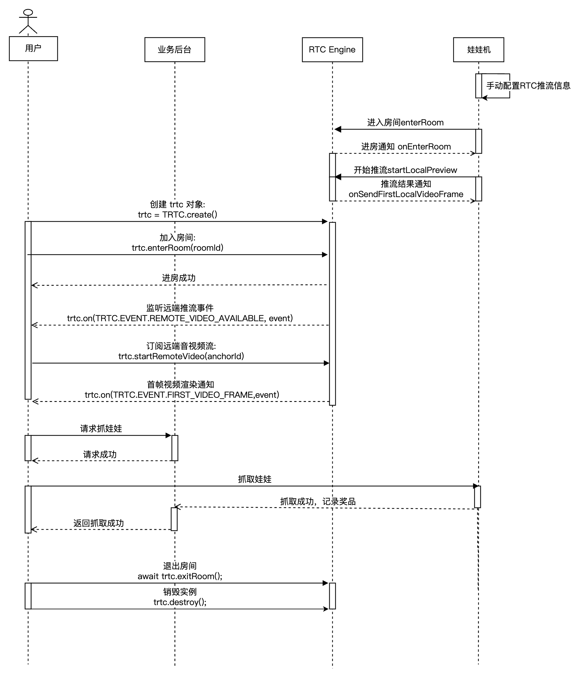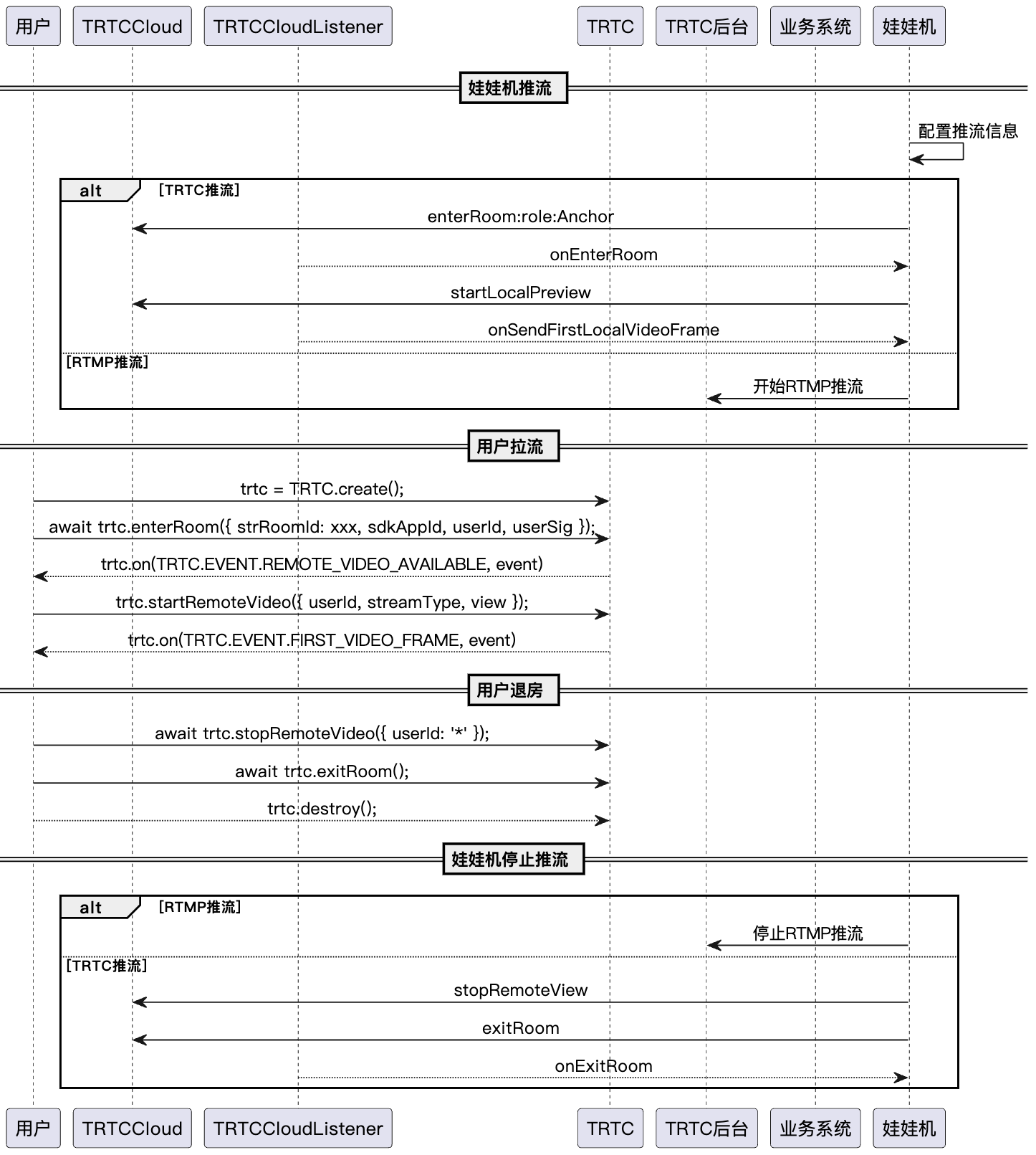 const trtc = TRTC.create();// 进入房间try {await trtc.enterRoom({ strRoomId, scene:'rtc', sdkAppId, userId, userSig});console.log('进房成功');} catch (error) {console.error('进房失败' + error);}