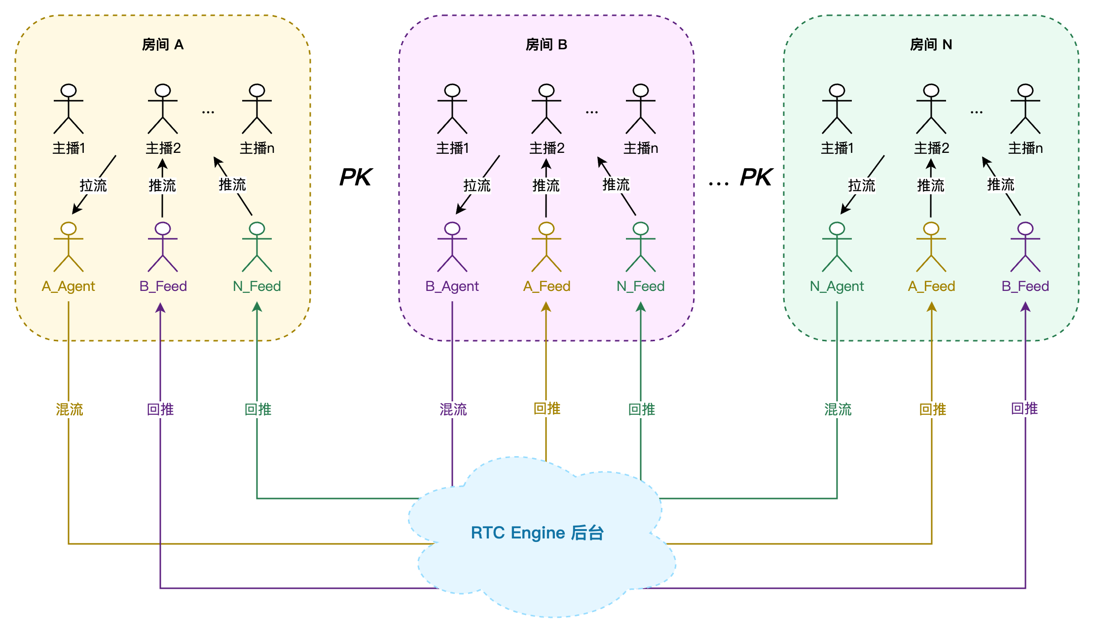 纯服务端方案,客户端无需额外处理 | 存在额外的机器人推拉流及混流费用 | 最多支持 11 个房间同时进行跨房 PK,每个房间最多支持 16 个主播同时参与跨房 PK | 多个房间,多主播(多人)跨房 PK,纯服务端管理 |