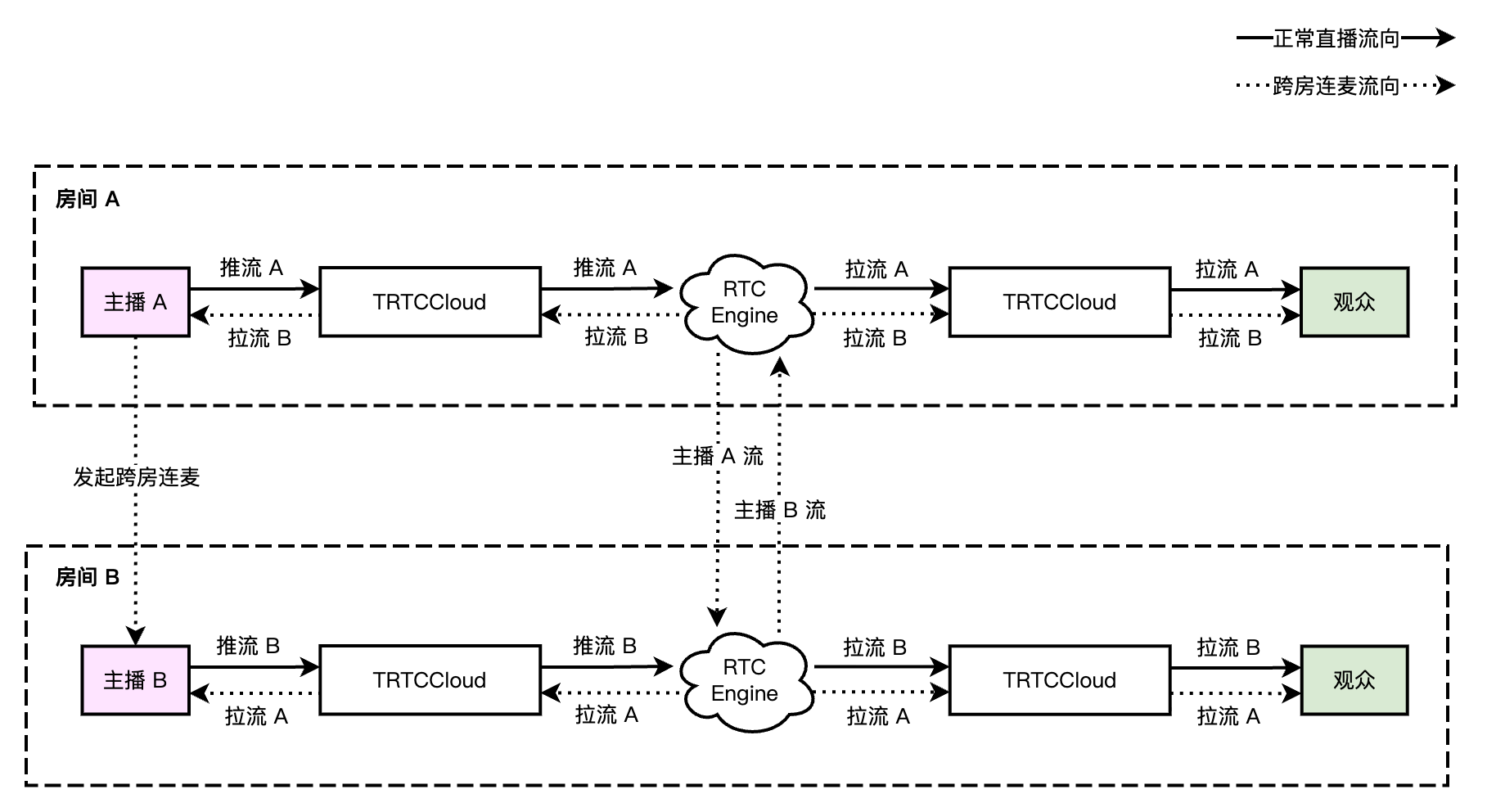 onRemoteUserEnterRoom(B) 和 onUserVideoAvailable(B,true) 这两个事件回调,即房间“101”中的用户都可以订阅主播 B 的音视频。onRemoteUserEnterRoom(A) 和 onUserVideoAvailable(A,true) 这两个事件回调,即房间“102”中的用户都可以订阅主播 A 的音视频。ConnectOtherRoom 建立跨房连麦即可,请勿双向调用。ConnectOtherRoom 与多个房间的主播建立跨房连麦,目前限制单个主播最多和其他房间的 9 个主播进行跨房连麦。