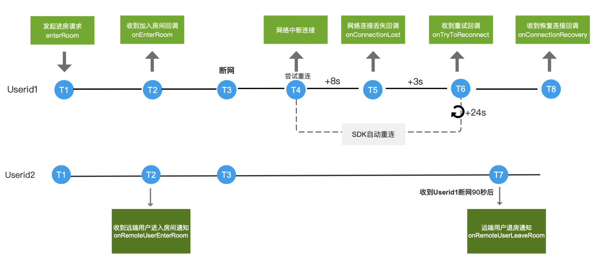 enterRoom 接口发起进房请求。onEnterRoom 回调,Userid2 感知 Userid1 存在延迟,大约300ms后,Userid2 收到 onRemoteUserEnterRoom 回调。onConnectionLost 断连回调。onTryToReconnect 重试回调。onTryToReconnect 重试回调。onRemoteUserLeaveRoom 回调。onConnectionRecovery 恢复回调。@Overridepublic void onConnectionLost() {// 连接断开Log.d(TAG, "onConnectionLost");}@Overridepublic void onTryToReconnect() {// 尝试重连Log.d(TAG, "onTryToReconnect");}@Overridepublic void onConnectionRecovery() {// 重连成功Log.d(TAG, "onConnectionRecovery");}