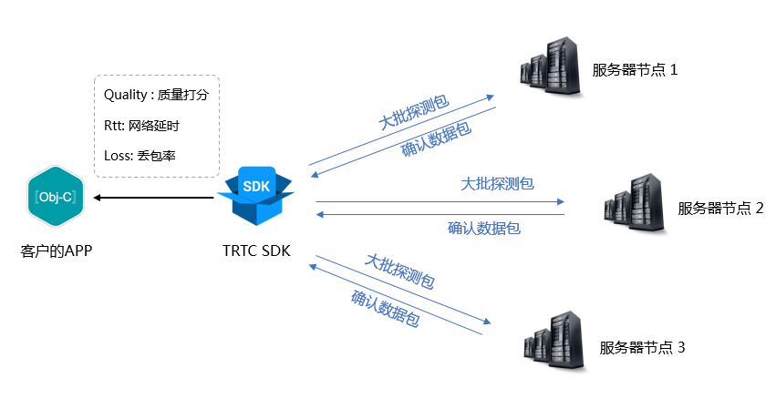 // 启动网络测速的示例代码, 需要 sdkAppId 和 UserSig,(获取方式参考基本功能)// 这里以登录后开始测试为例- (void)onLogin:(NSString *)userId userSig:(NSString *)userSid{TRTCSpeedTestParams *params;// sdkAppID 为控制台中获取的实际应用的 AppIDparams.sdkAppID = sdkAppId;params.userID = userId;params.userSig = userSig;// 预期的上行带宽(kbps,取值范围: 10 ~ 5000,为 0 时不测试)params.expectedUpBandwidth = 5000;// 预期的下行带宽(kbps,取值范围: 10 ~ 5000,为 0 时不测试)params.expectedDownBandwidth = 5000;[trtcCloud startSpeedTest:params];}- (void)onSpeedTestResult:(TRTCSpeedTestResult *)result {// 测速完成后,返回测速结果}
