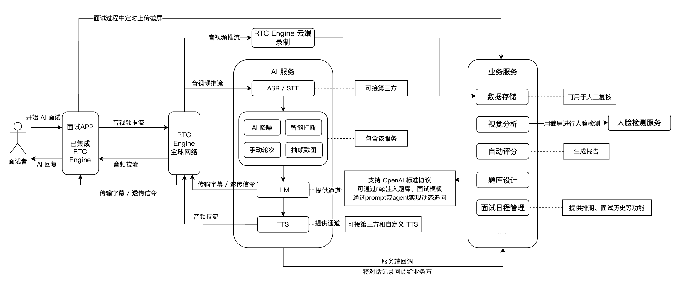 实时音视频 | 基于 RTC Engine 提供高质量、低延迟的音视频连线,支持720P/1080P/2K 高清画质和48kHz 高音质。无论网络环境如何,均能保障流畅互动,模拟真实面试场景。 |