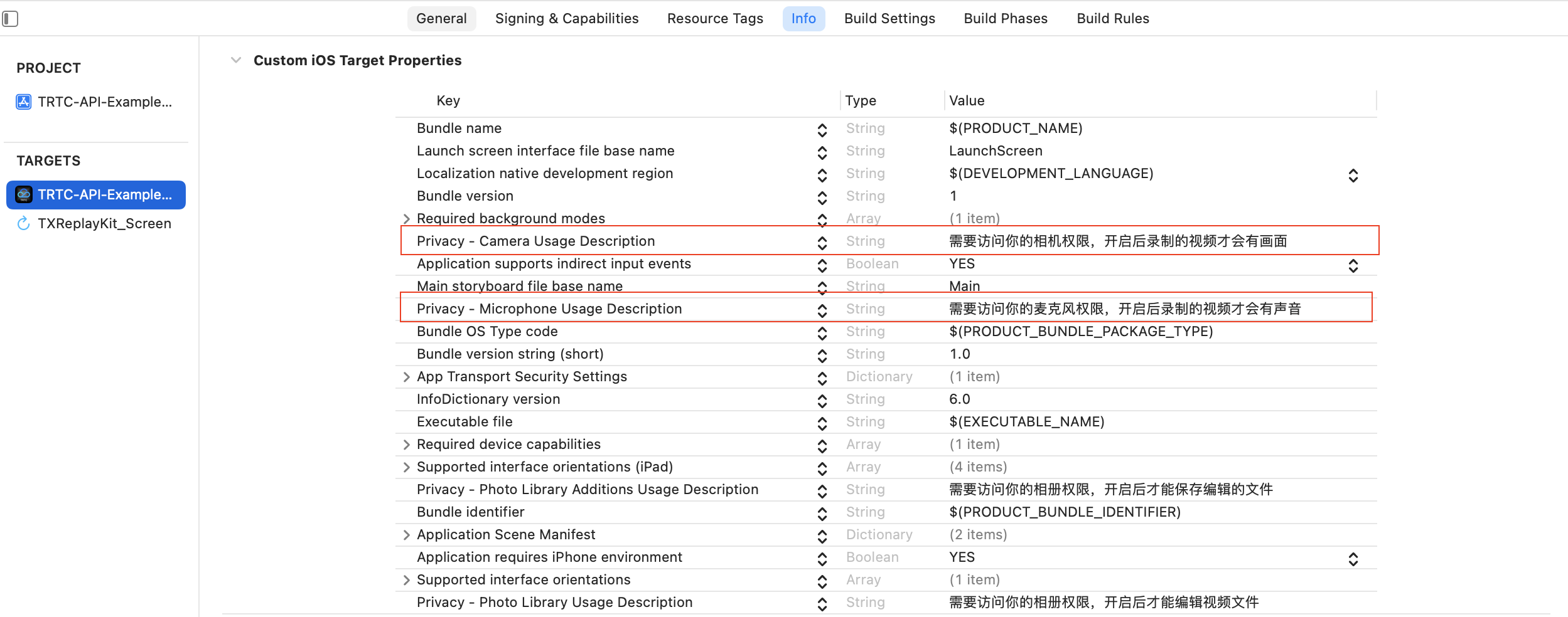 Privacy - Microphone Usage Description, 同时填入麦克风使用目的提示语Privacy - Camera Usage Description,并填入摄像头使用目的提示语。