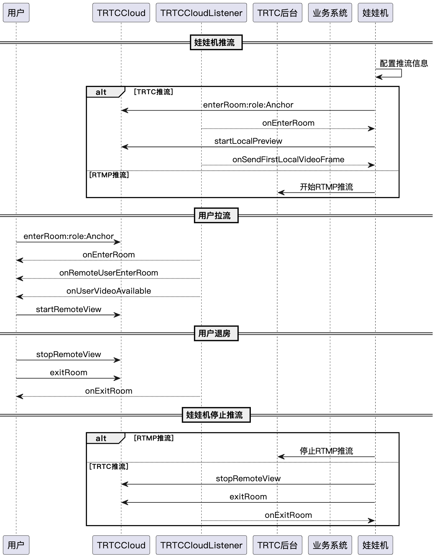 // 创建 RTC Engine SDK 实例(单例模式)self.trtcCloud = [TRTCCloud sharedInstance];// 设置事件监听器self.trtcCloud.delegate = self;// 来自 SDK 的各类事件通知(比如:错误码,警告码,音视频状态参数等)- (void)onError:(TXLiteAVError)errCode errMsg:(nullable NSString *)errMsg extInfo:(nullable NSDictionary *)extInfo {NSLog(@"%d: %@", errCode, errMsg);}- (void)onWarning:(TXLiteAVWarning)warningCode warningMsg:(nullable NSString *)warningMsg extInfo:(nullable NSDictionary *)extInfo {NSLog(@"%d: %@", warningCode, warningMsg);}// 移除事件监听器self.trtcCloud.delegate = nil;// 销毁 RTC Engine SDK 实例(单例模式)[TRTCCloud destroySharedIntance];