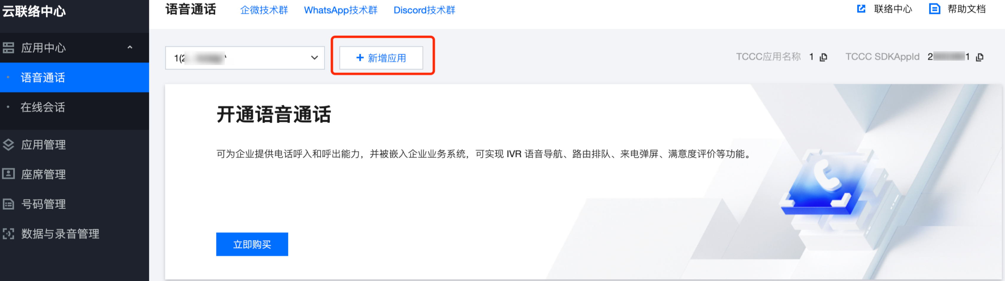 应用中心 > 语音通话。新用户创建应用后自动赠送云联络中心核心功能体验14天。