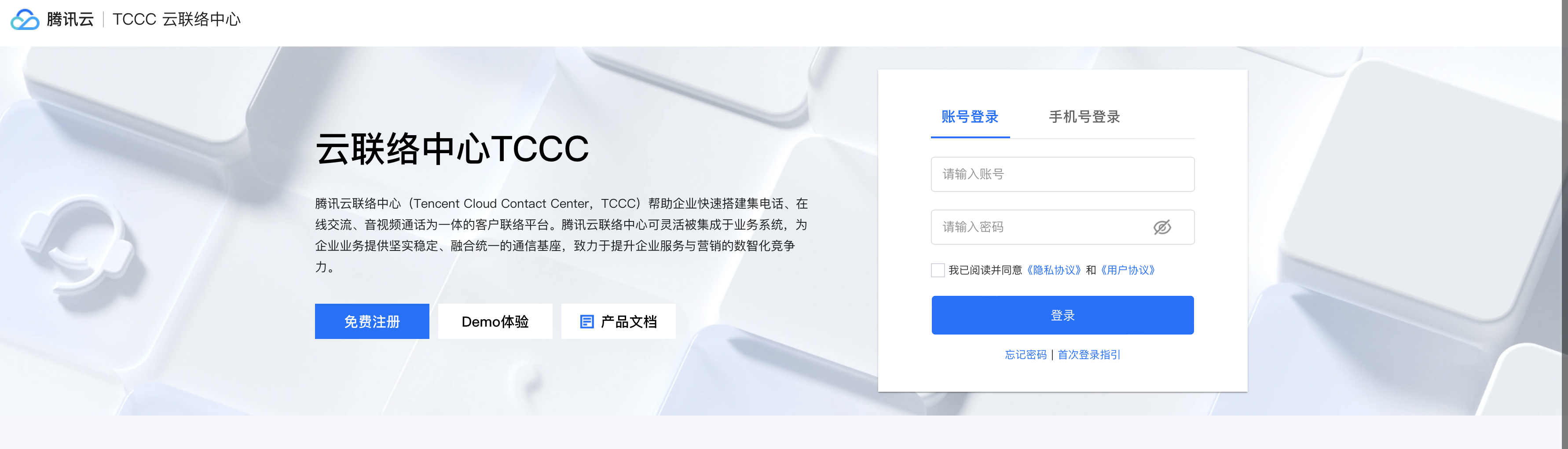 云联络中心管理端:为您的业务提供座席、技能组、IVR 配置;数据看板、通话记录、座席状态等查看(与云控制台为两套账号体系)。