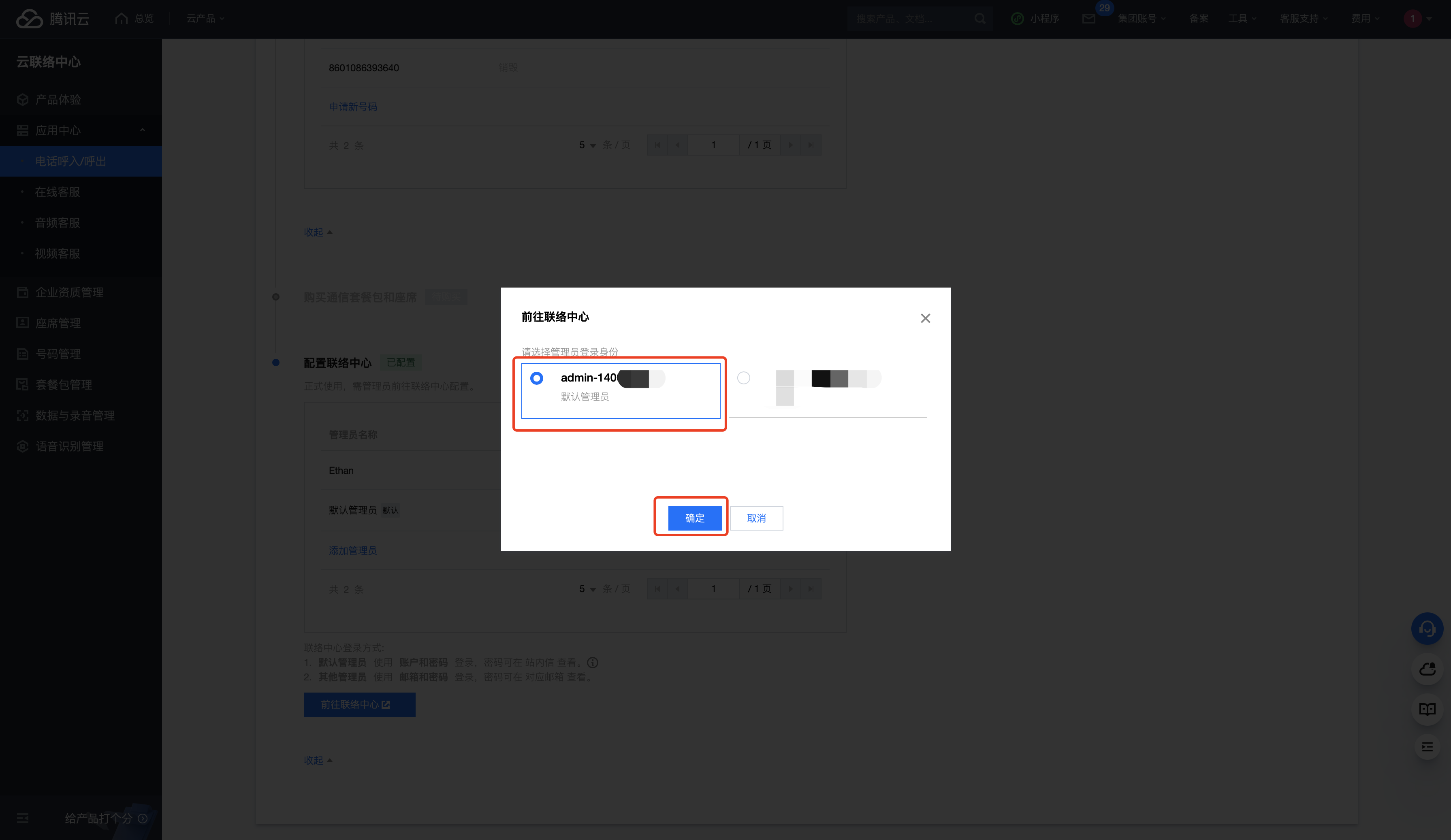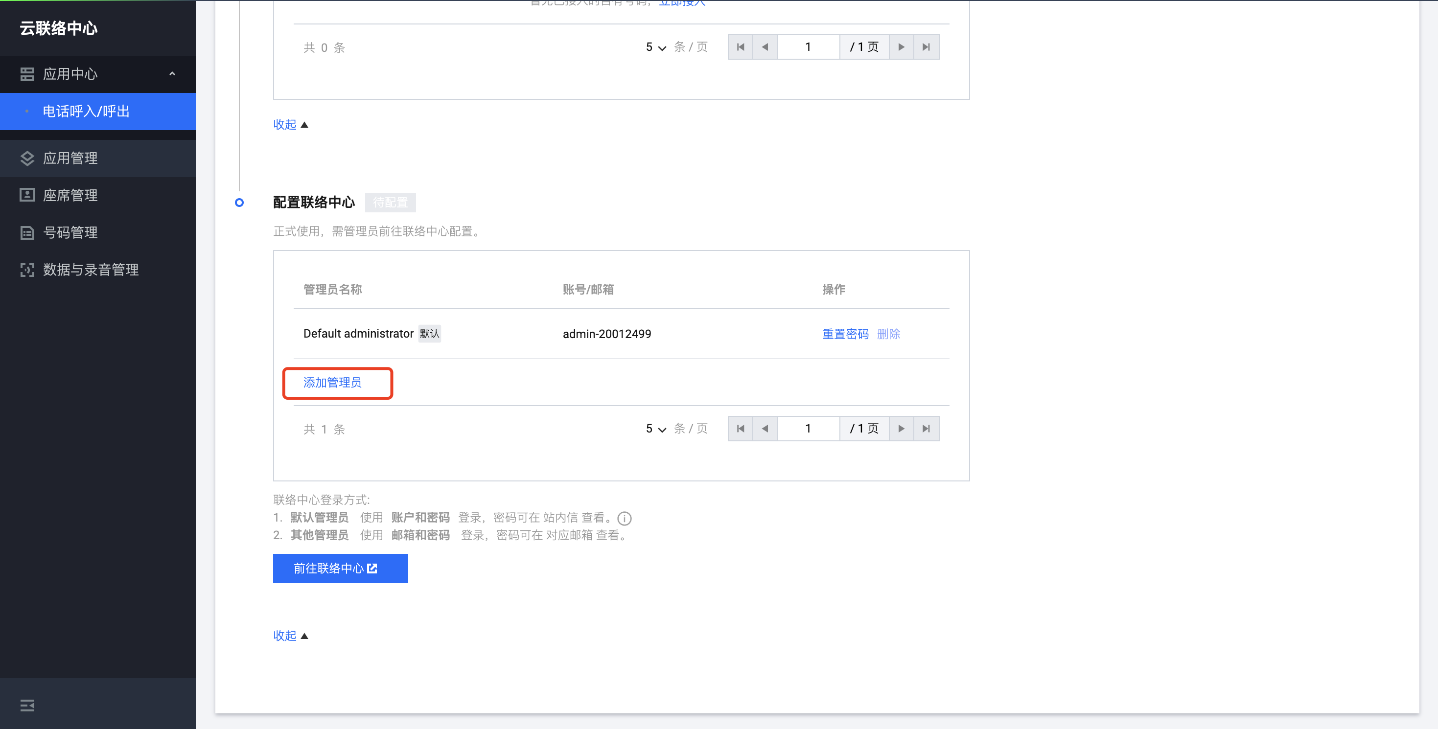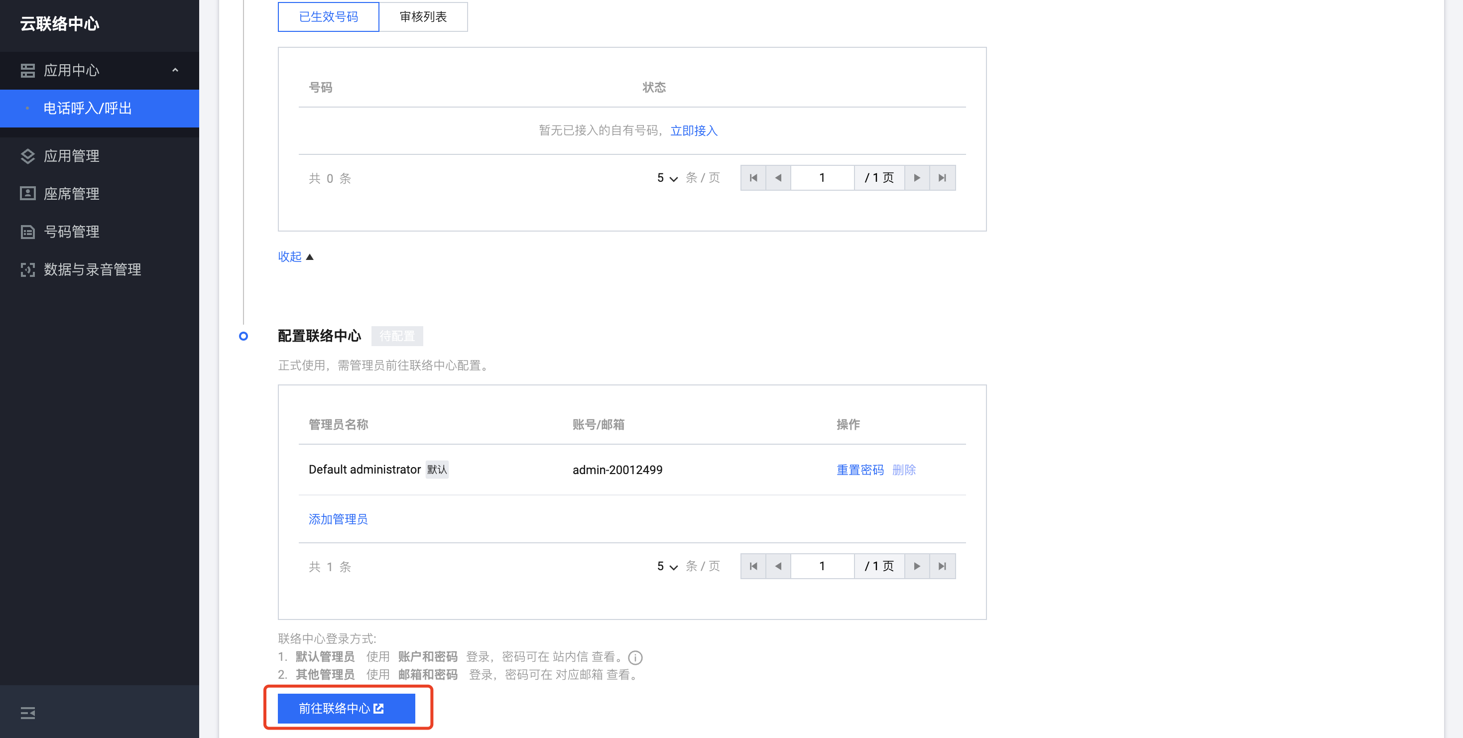 使用默认管理员账号可以免密登录云联络中心管理端。如需查看默认管理员密码,可前往控制台的站内信查看。