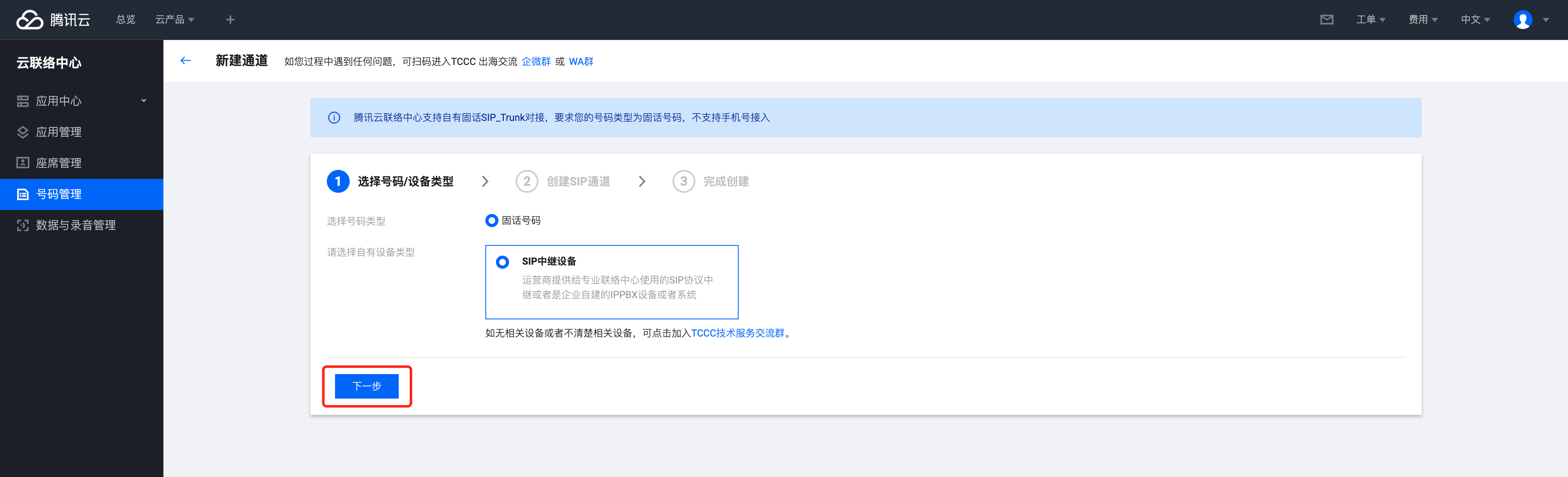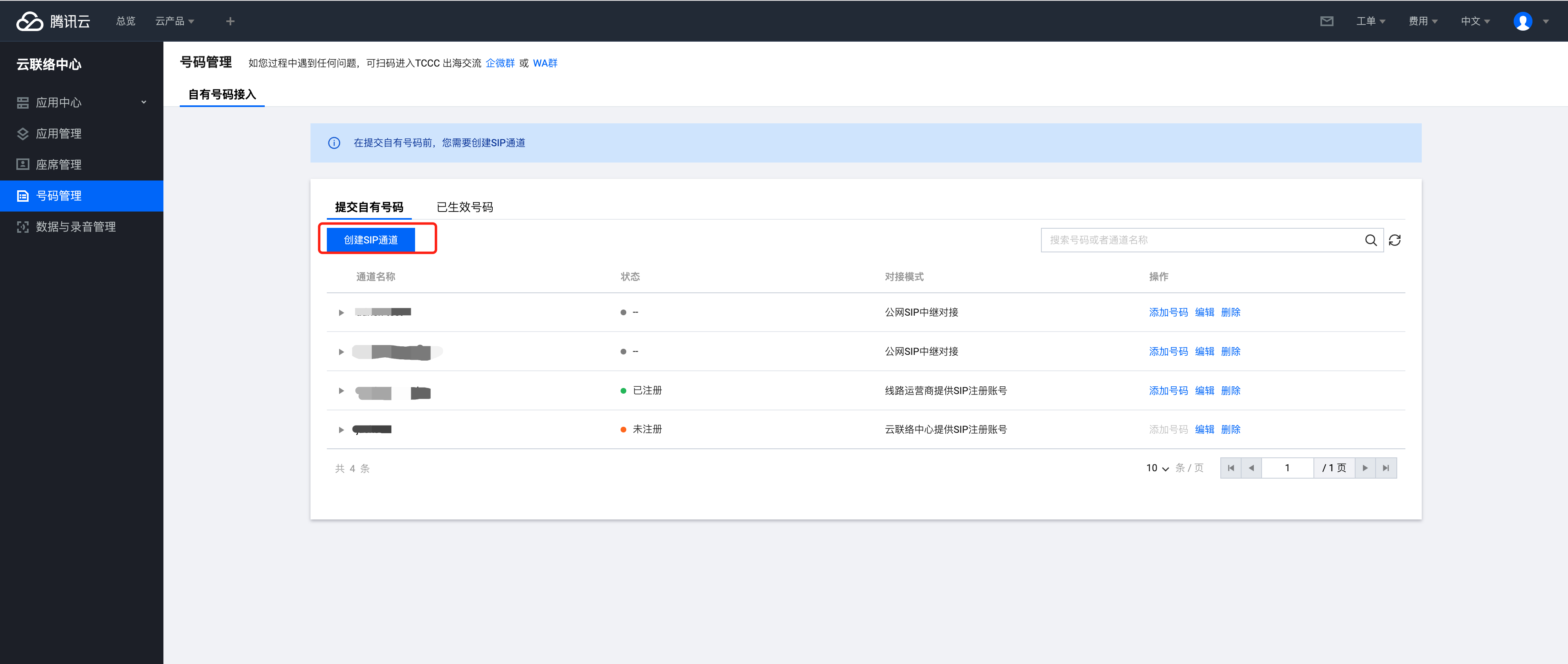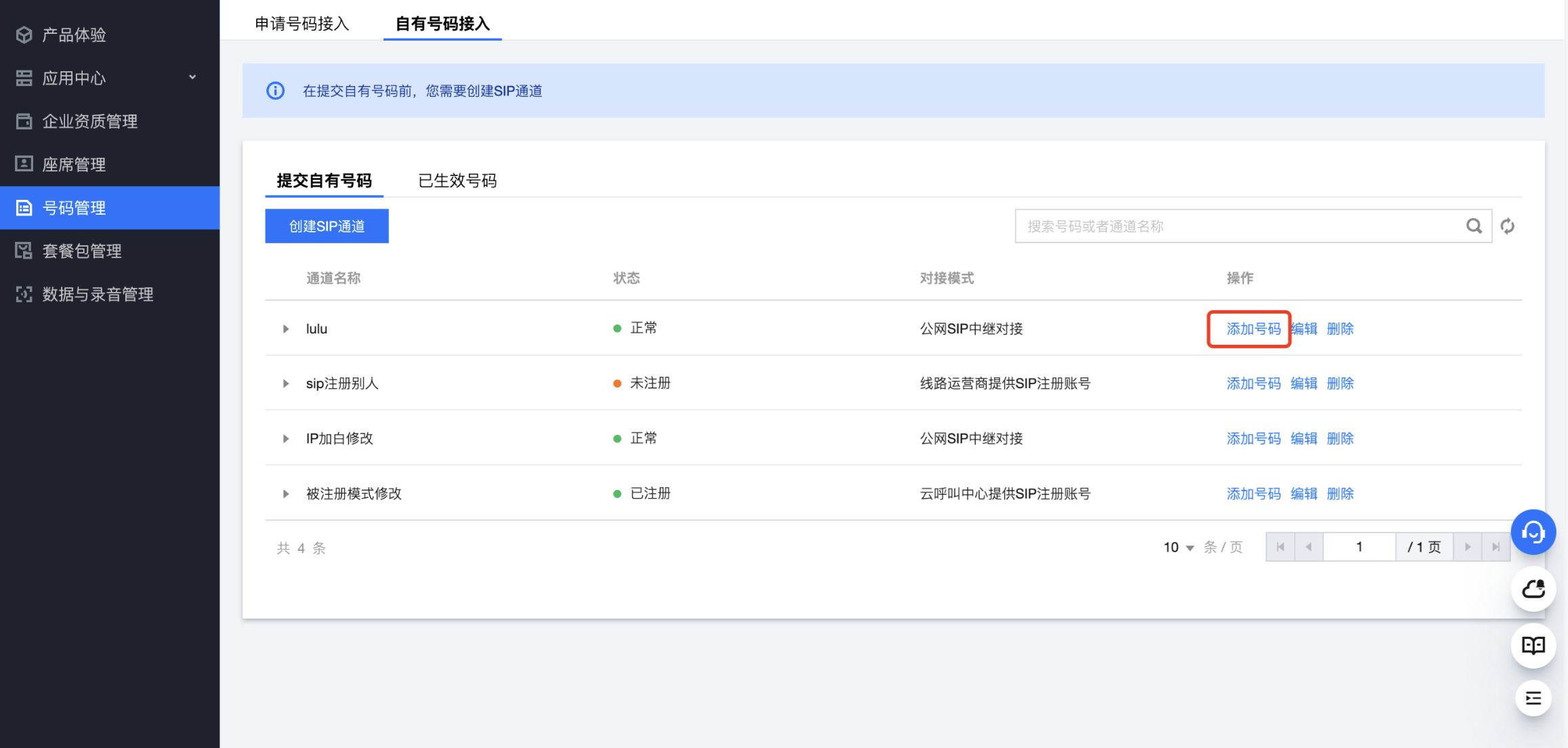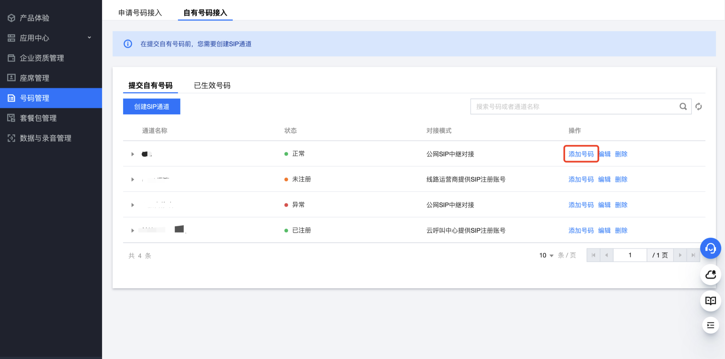 1. SIP 通道创建成功后,请在您通道下点击 添加号码。