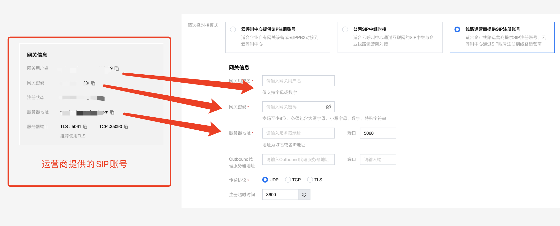 适合企业线路运营商提供 SIP 注册账号,云呼叫中心通过 SIP 账号注册到线路运营商,将运营商提供的 SIP 账号信息配置到网关内。