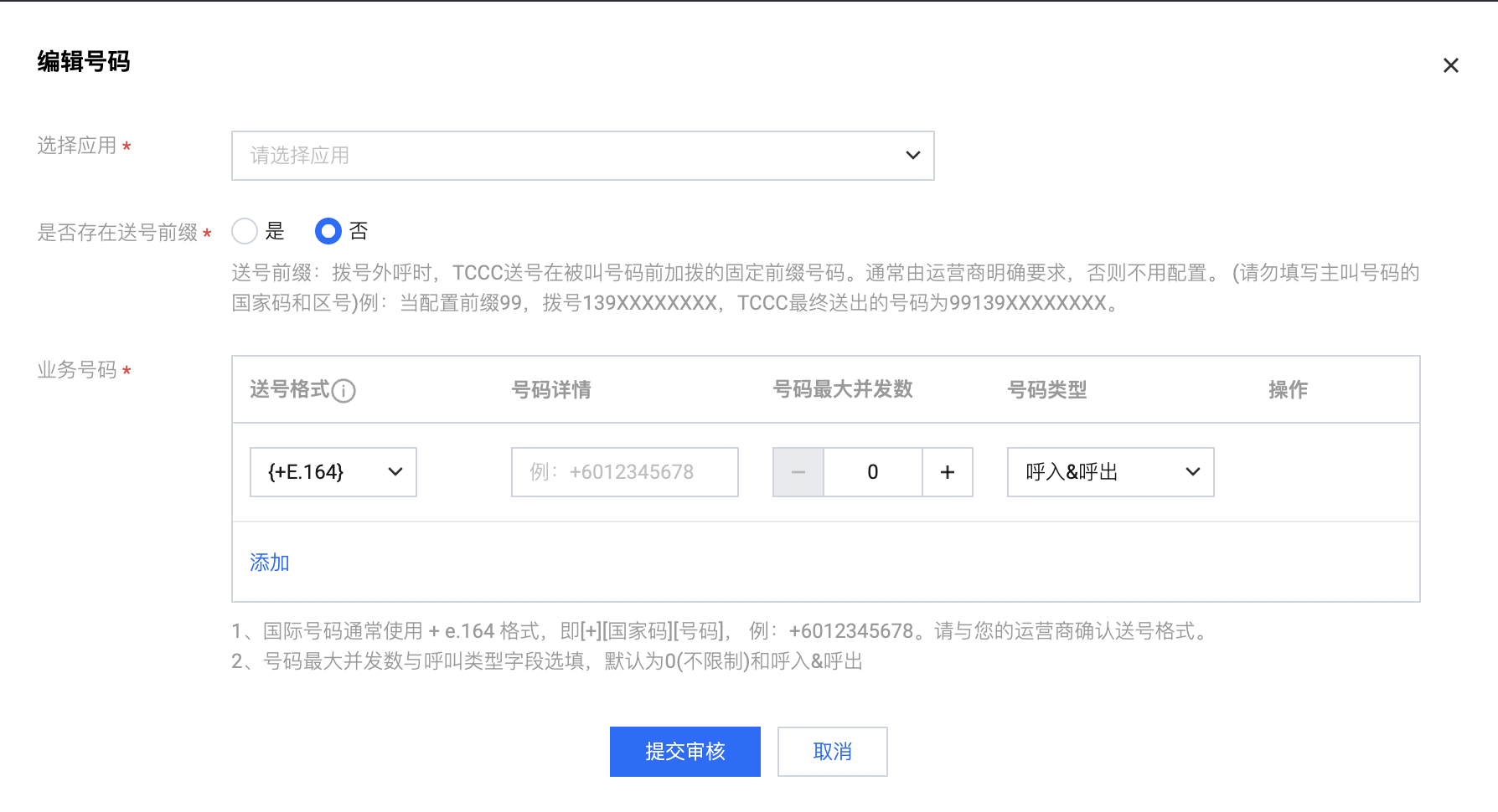 国际号码通常使用 +E.164 格式,及【+】【国家码】【号码】(例:+86123456789)。部分运营商使用E.164(即不带加号)。建议您在填写时与运营商确认送号格式