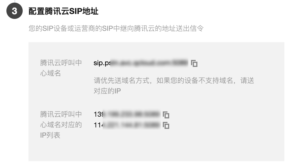 3. 配置腾讯云 SIP 地址,用于您的 SIP 设备或运营商的 SIP 中继向腾讯云的地址送出信令。