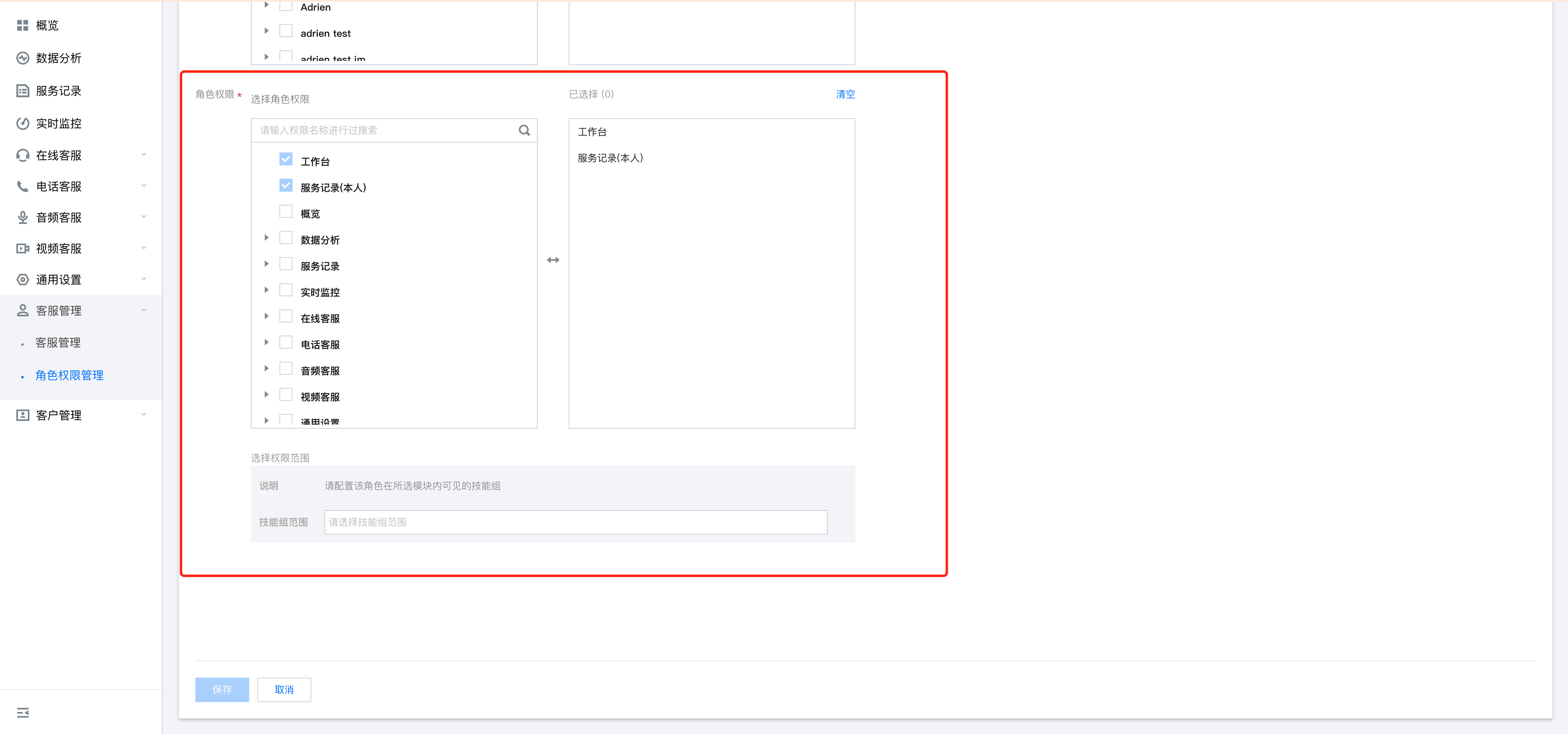 选择该角色在管理端的可见范围,针对数据分析、服务记录、实时监控等模块支持设置在此类模块内能查看的技能组范围。(例:选择数据分析 > 电话客服后,技能组范围设置为 A,该角色在数据分析 > 电话客服模块内仅能查看 A 技能组的数据),选择后单击保存。 变更角色