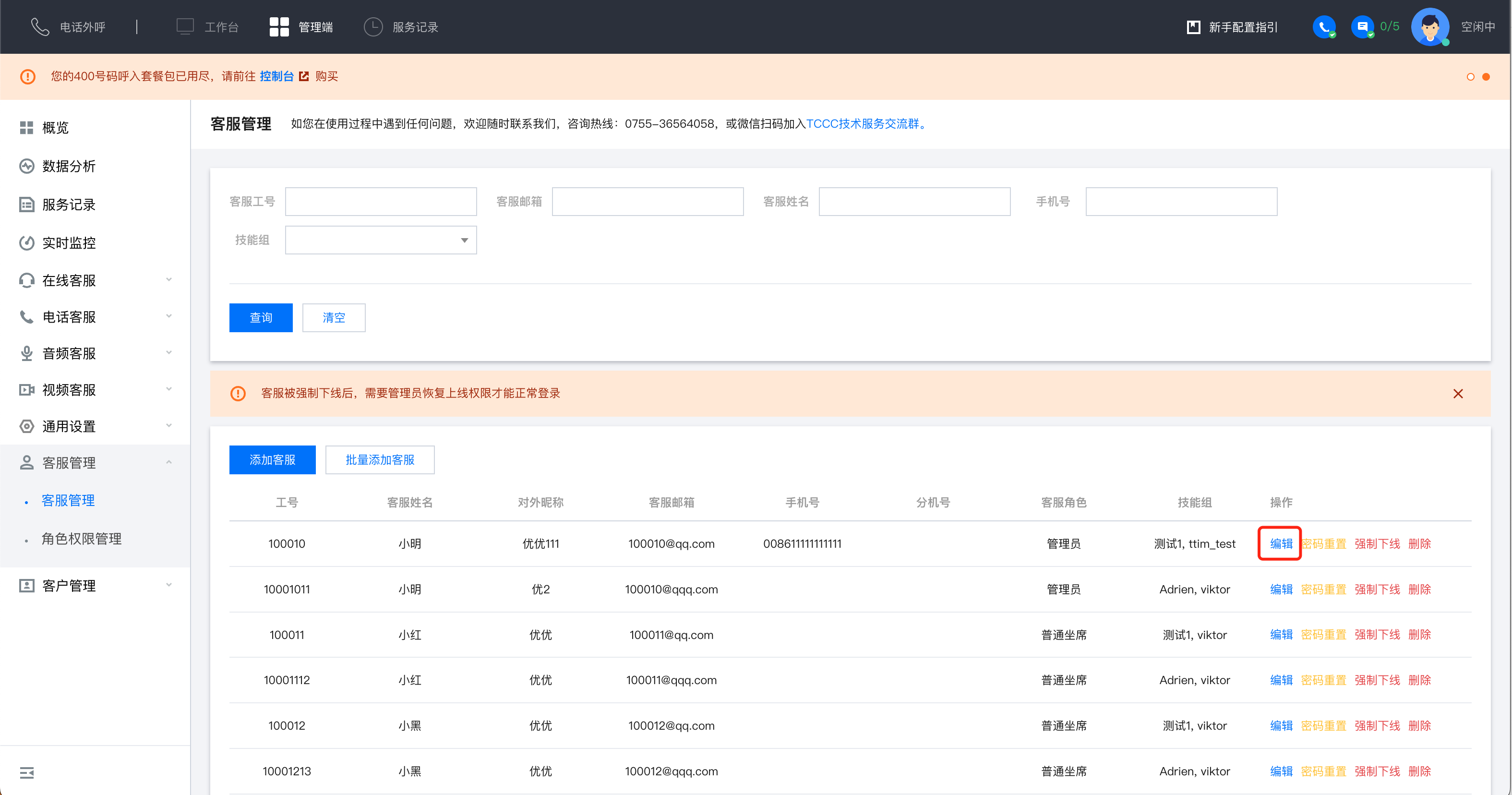 1. 选择需要变更角色的客服人员,单击编辑。