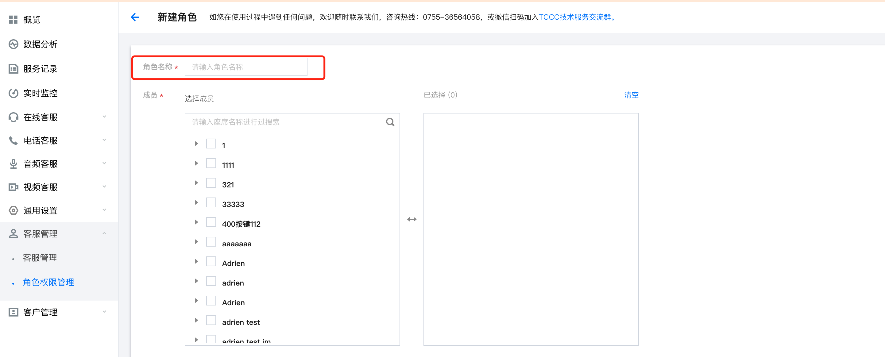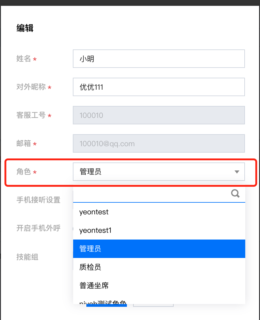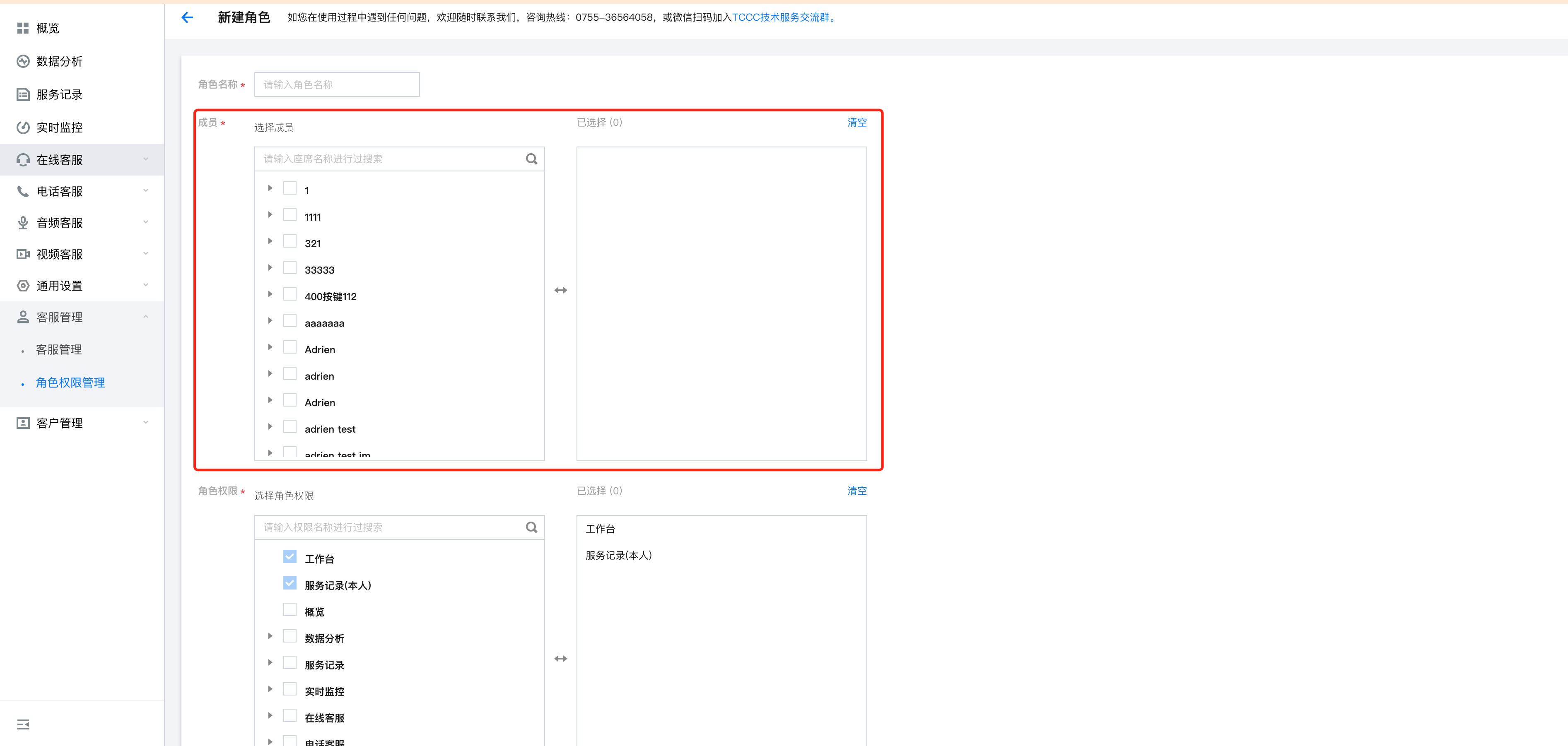 2. 为客服人员选择合适的角色。