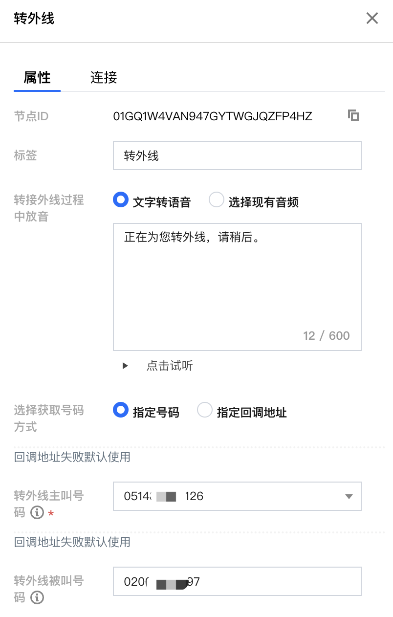 转外线主叫号码 | 转外线时外呼使用的号码,下拉菜单中展示的为系统所有的可外呼号码列表。 | 020-6624XXXX |
