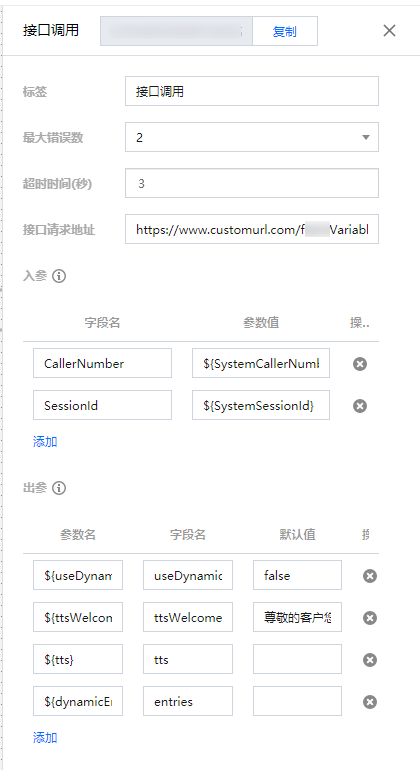 https://www.customurl.com/fetchVariables请求{"Callee":"008618621500000"}返回{"tts":"按一转咨询,按二转购买","dynamicEntries":"[{\\"digits\\": \\"1\\",\\"next\\": \\"01FN8J6WZ984WR9PP4ZZTC8YXS\\",\\"label\\": \\"咨询\\",\\"name\\": \\"120b5ad2-6b6e-49e8-ade7-d952e7de6f32\\"},{\\"digits\\": \\"2\\",\\"next\\": \\"01FN8J92EH5HP4SBS5W4MXZD0J\\",\\"label\\": \\"购买\\",\\"name\\": \\"4ac833b5-9019-4ba9-8c5a-a11fb893dca2\\"}]"}