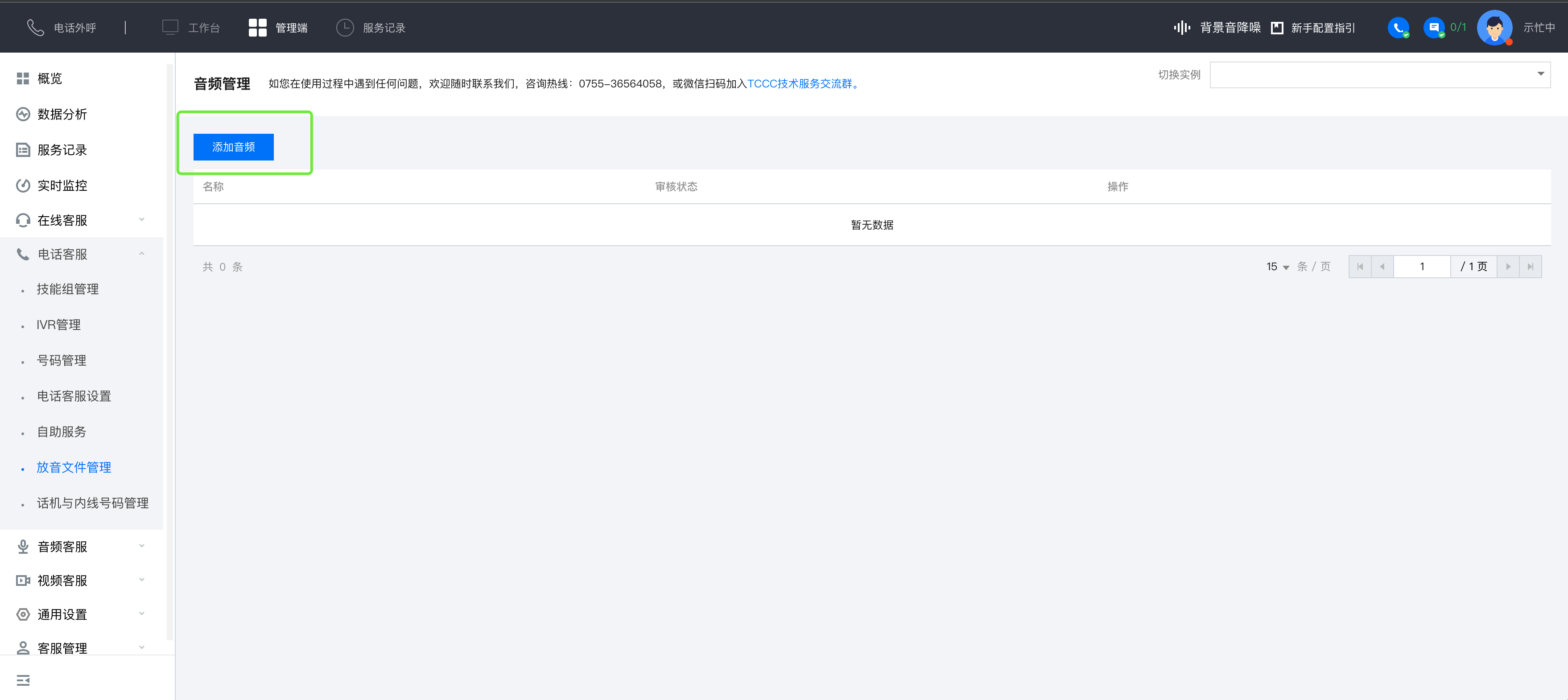 1. 直接访问 云联络中心 管理工作台,左侧导航栏单击管理端 > 电话客服 > 放音文件管理进入音频管理页面。在音频管理页面的右上角单击添加音频。 2. 在添加音频对话框中输入以下信息: