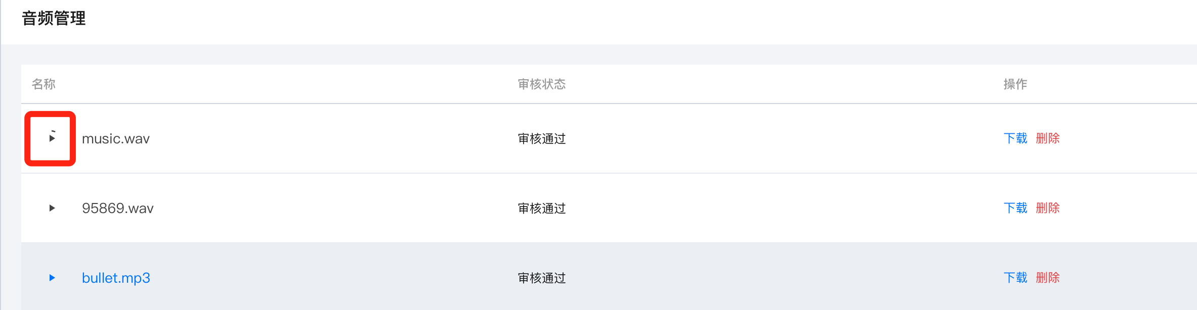 音频文件,选择音频文件上传即可,上传成功后会需要等待审核,审核通过后可以使用。