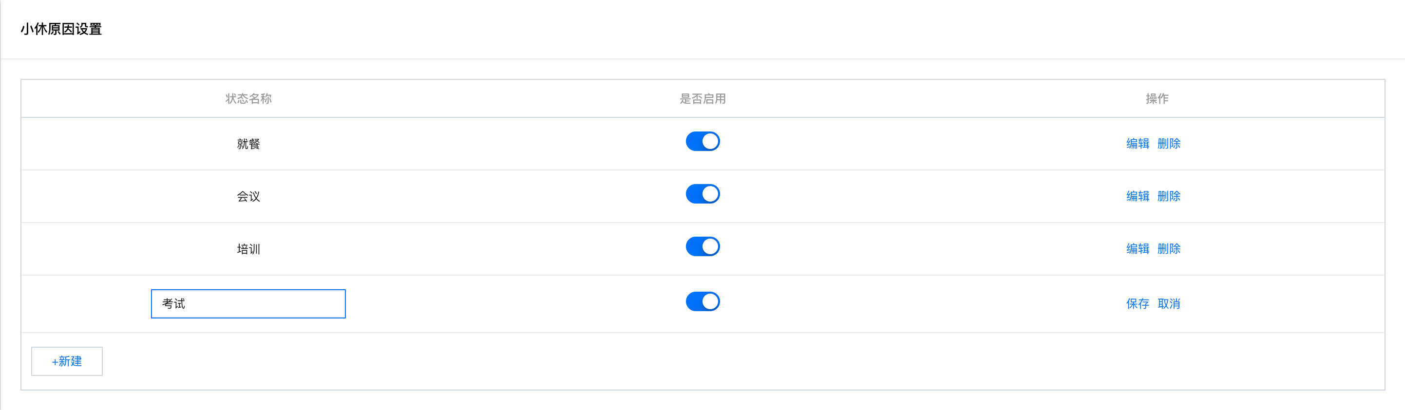 您可在小休原因设置对话框中新建小休原因,并设置是否启用。启用后座席在工作台小休时可选择预先设置好的小休原因,便于后续管理统计。