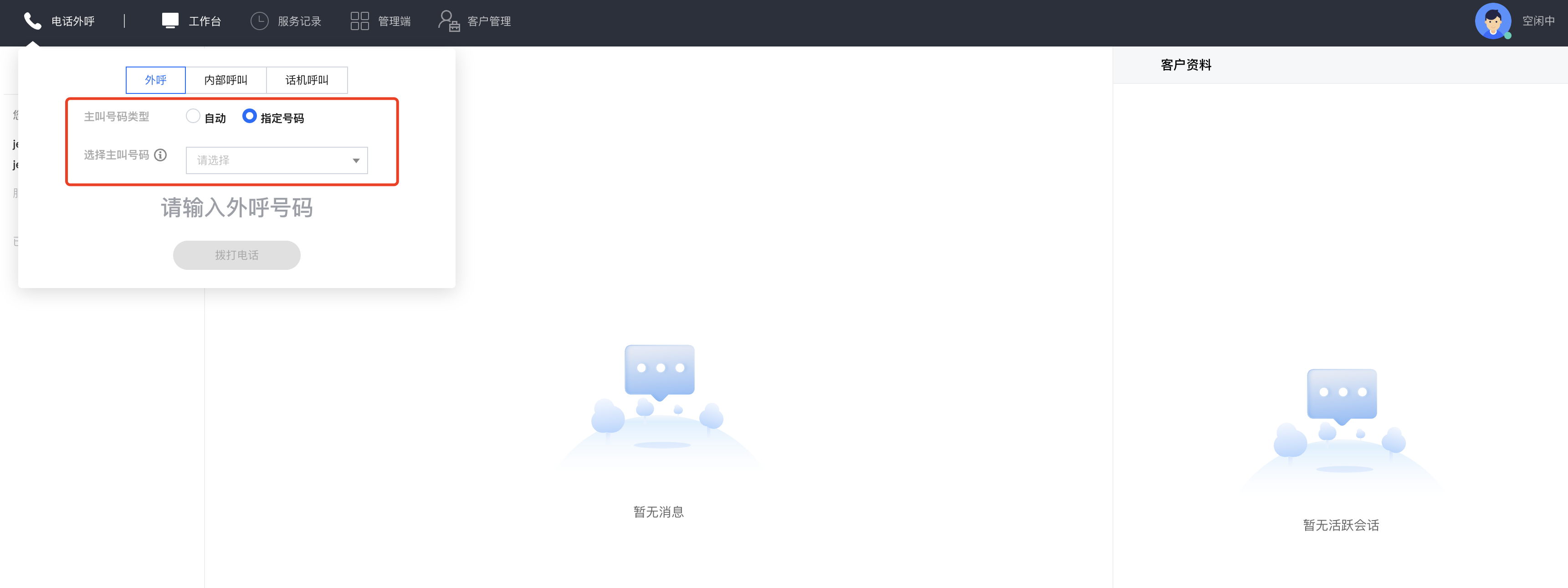 如果管理员在联络中心工作台对号码进行了相关配置,座席人员可在工作台的播号盘选择对应号码外呼。管理员配置时可在左侧导航栏单击