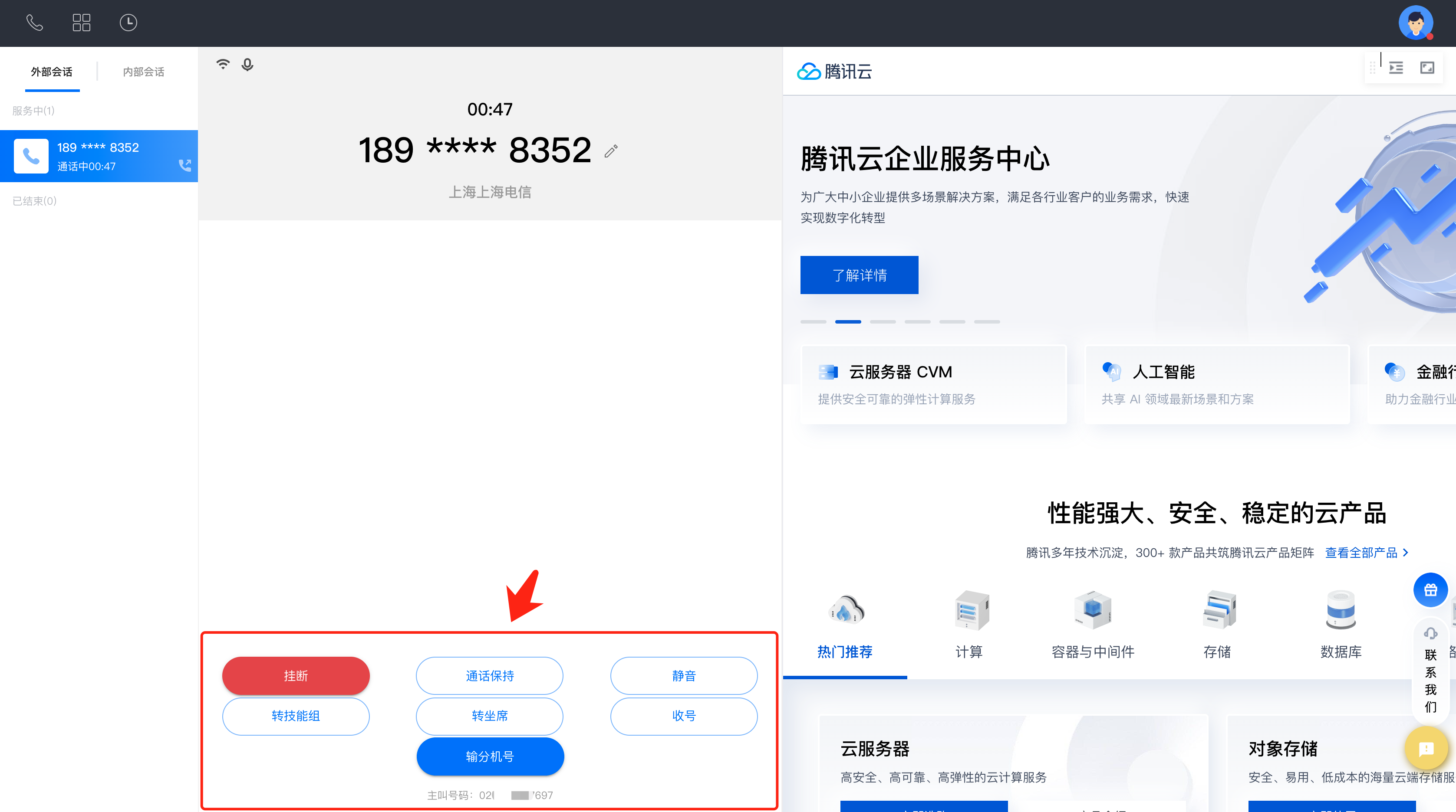 转外线 | 支持座席在通话中单击转外线,将该电话转接至第三方号码接听,相应的呼叫数据及用户信息可同步地随呼叫转移。 |