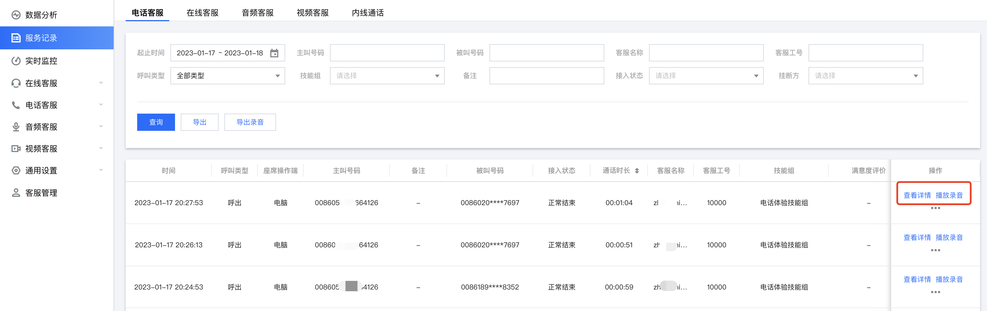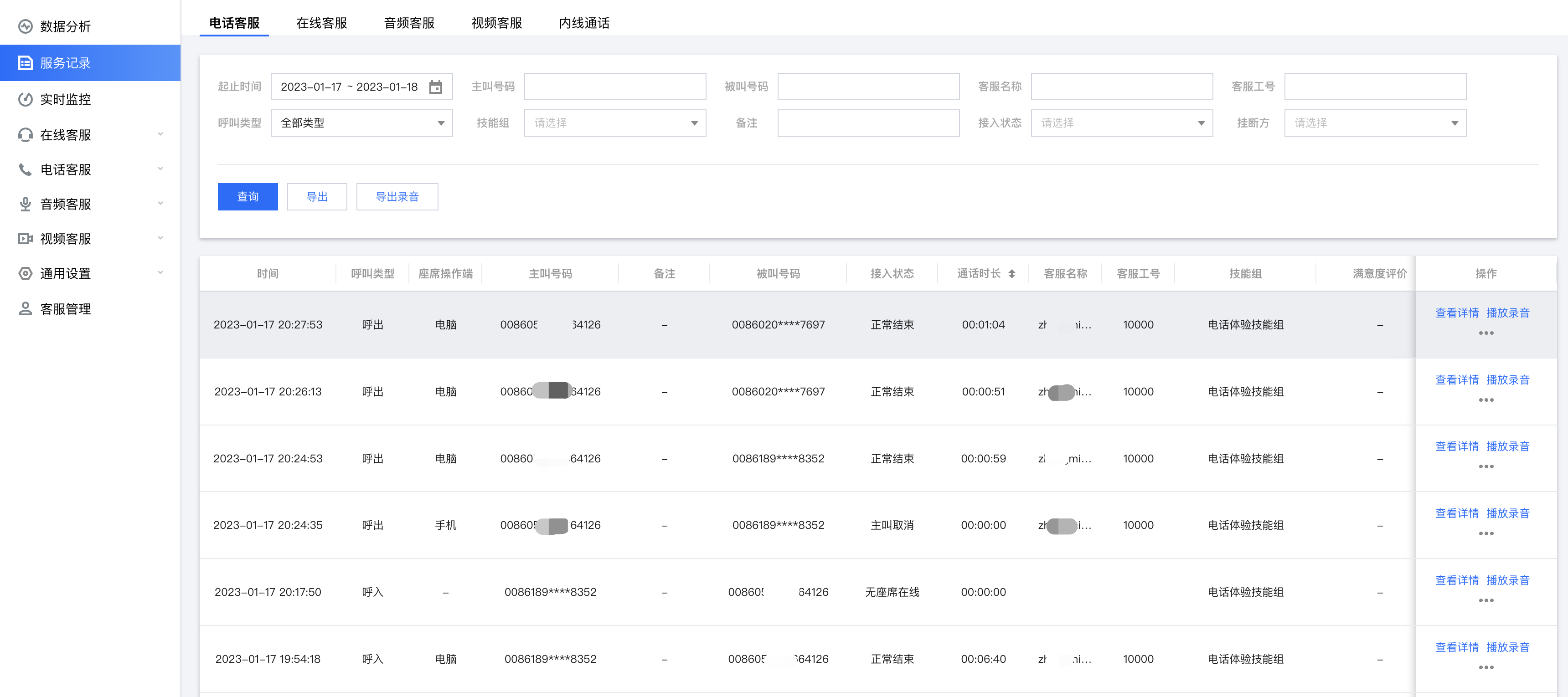 接入状态 | 电话呼入:正常结束、未接通、座席未接、座席转接、外线转接、IVR 期间用户放弃、IVR 后直接结束、会话排队期间用户放弃、会话振铃期间用户放弃、无座席在线、非工作时间、系统错误 电话呼出:未知状态、未接听、拒接挂断、关机、空号、通话中、欠费、运营商线路异常、主叫取消、不在服务区 |