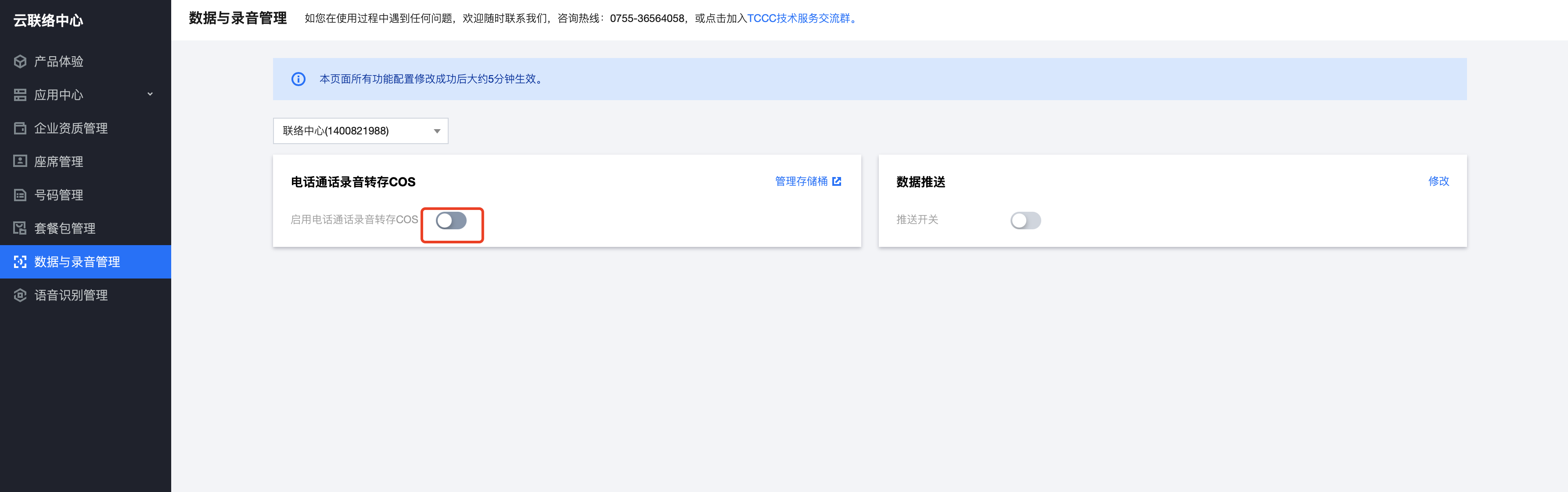 3. 开启电话通话录音转存 COS 开关,首次开启需要根据控制台指引进行 COS 授权。