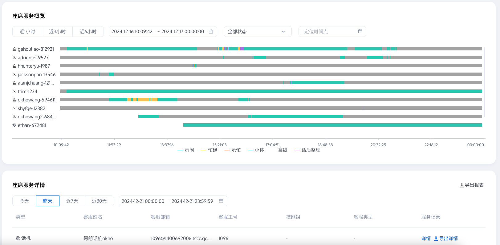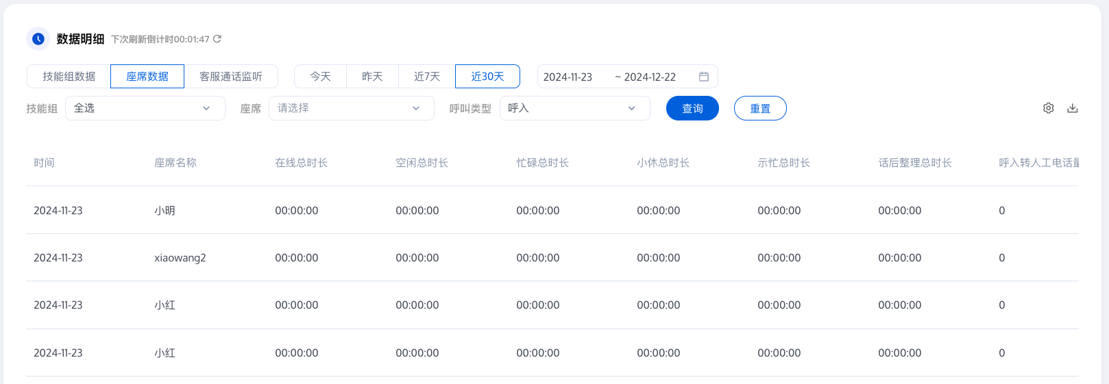 | 空闲总时长 | 该座席处于空闲状态的总时长。 |