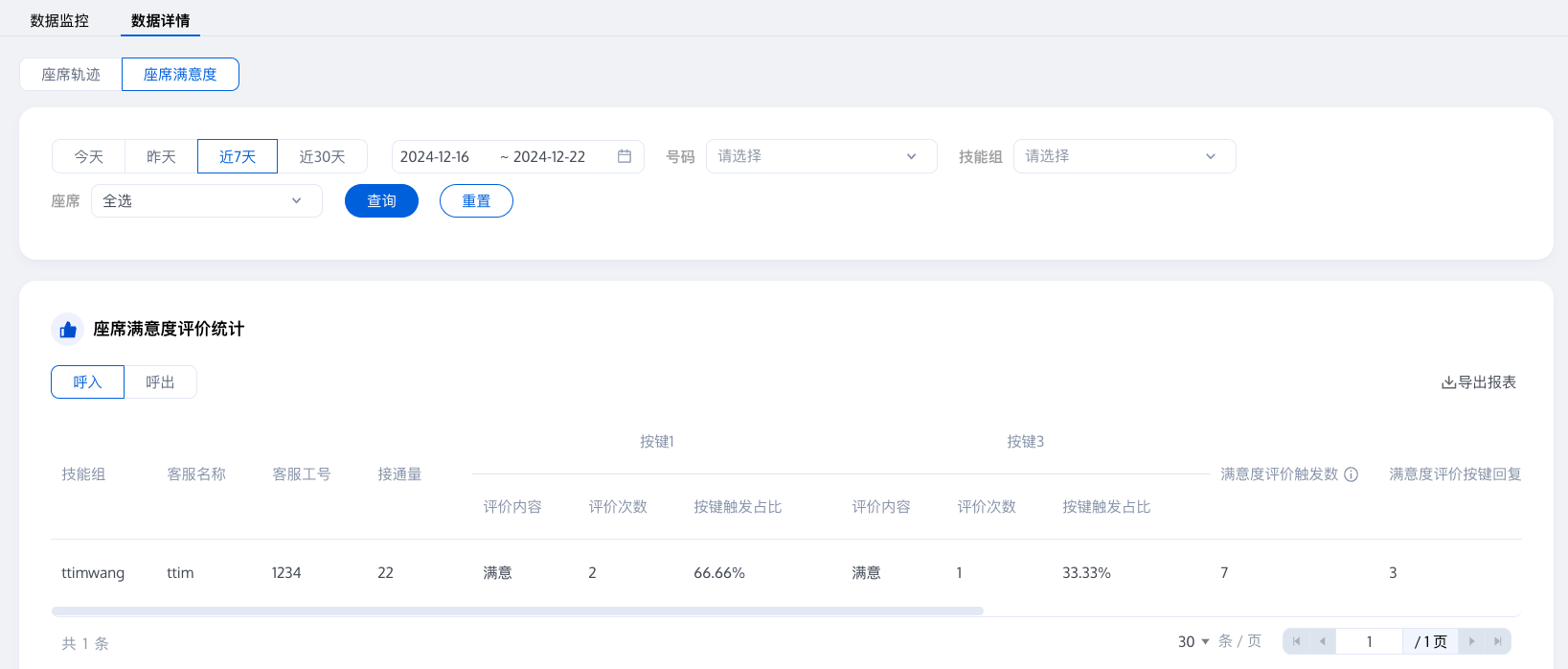 | 呼入满意度评价按键回复率 | 筛选范围内,呼入满意度评价按键回复数 / 呼入接通量。 |