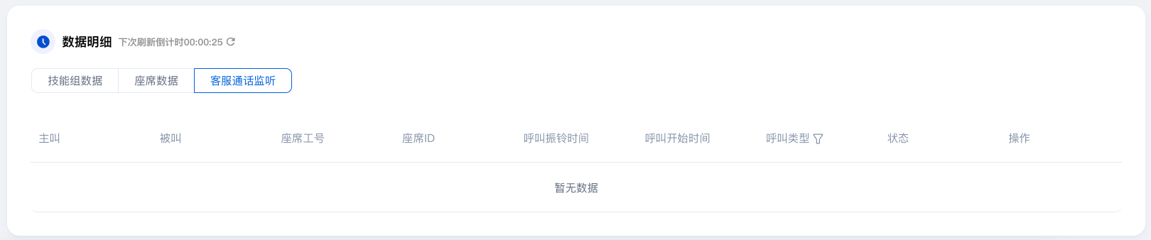不同状态 座席信息 | 当前忙碌座席数 | 当前时刻,该技能组内处于忙碌状态的座席数(实时数据)。 |