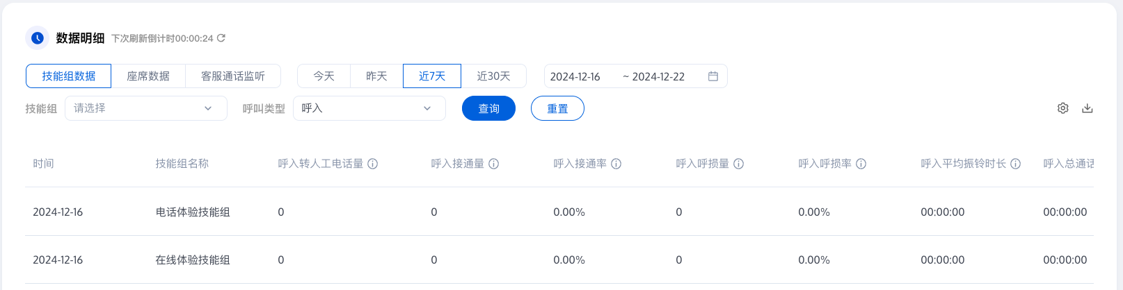 | 呼入接通量 | 转人工至该技能组中所有通话时长大于0的呼入电话量。 |