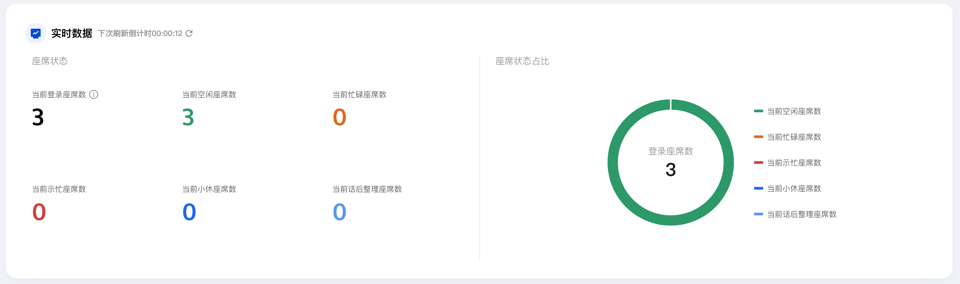 | 当前空闲座席数 | 当前时刻,该技能组内处于空闲状态的座席数(实时数据)。 |
